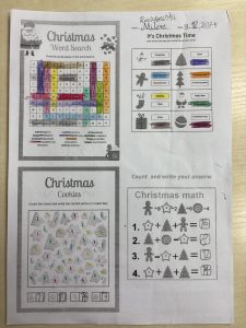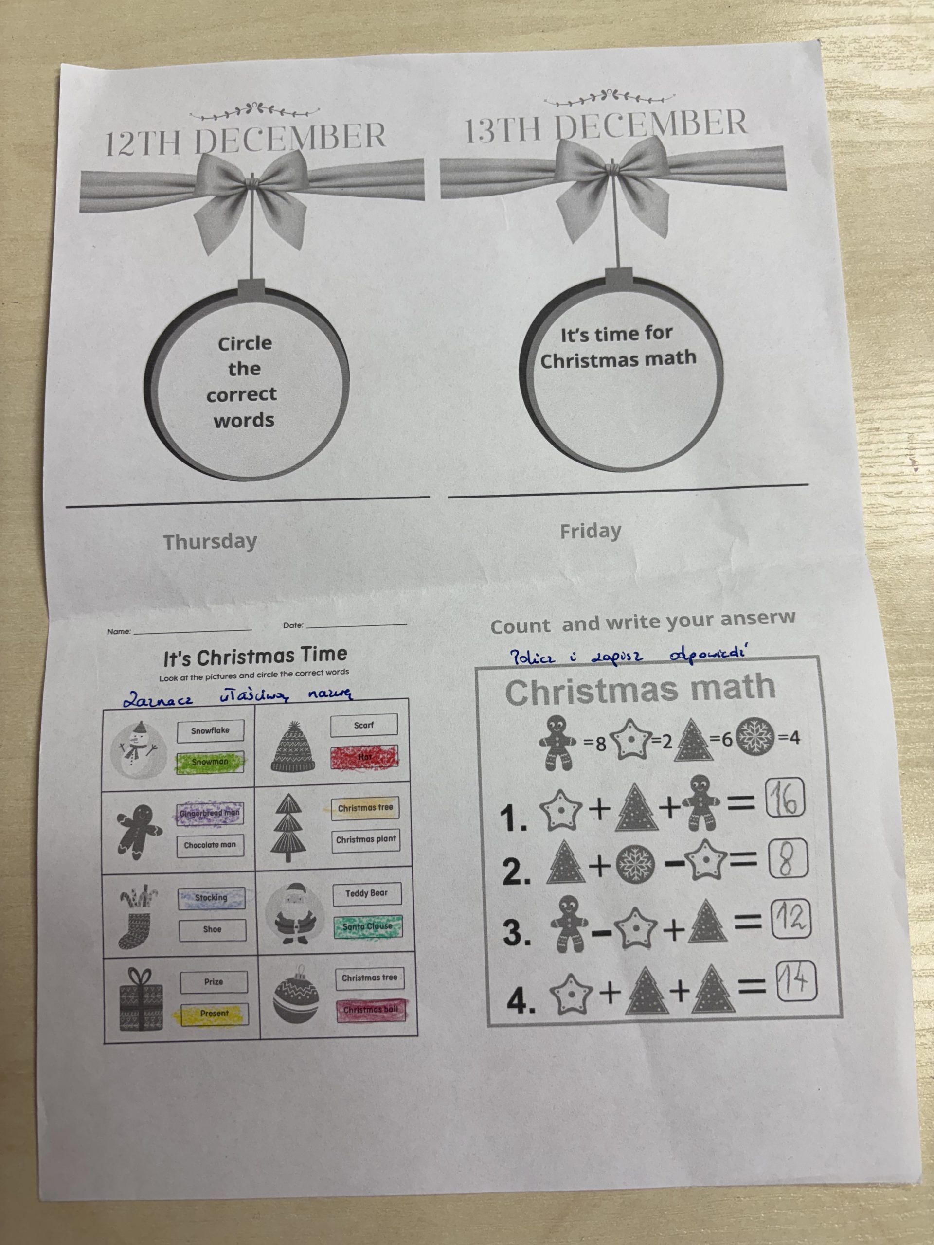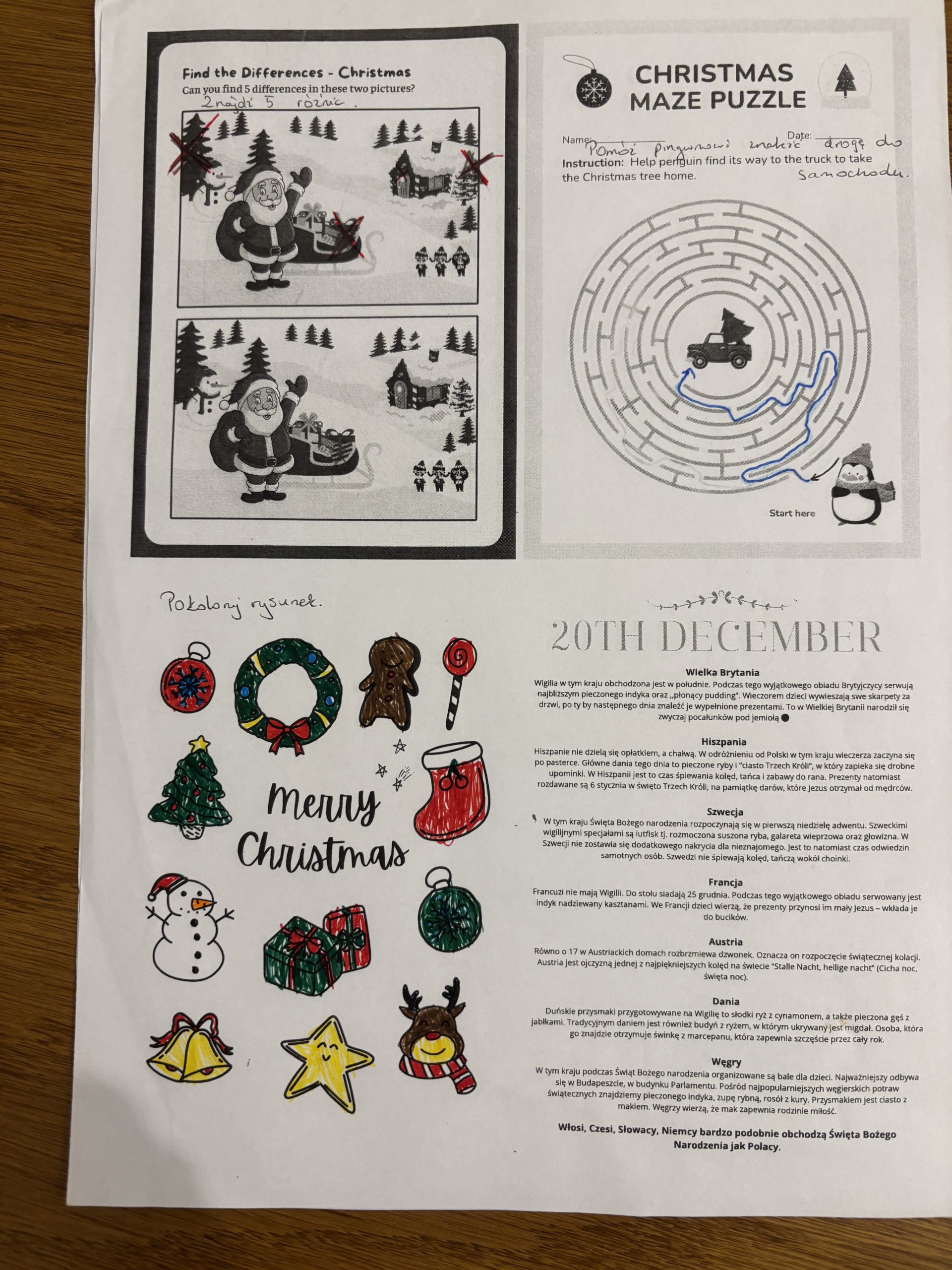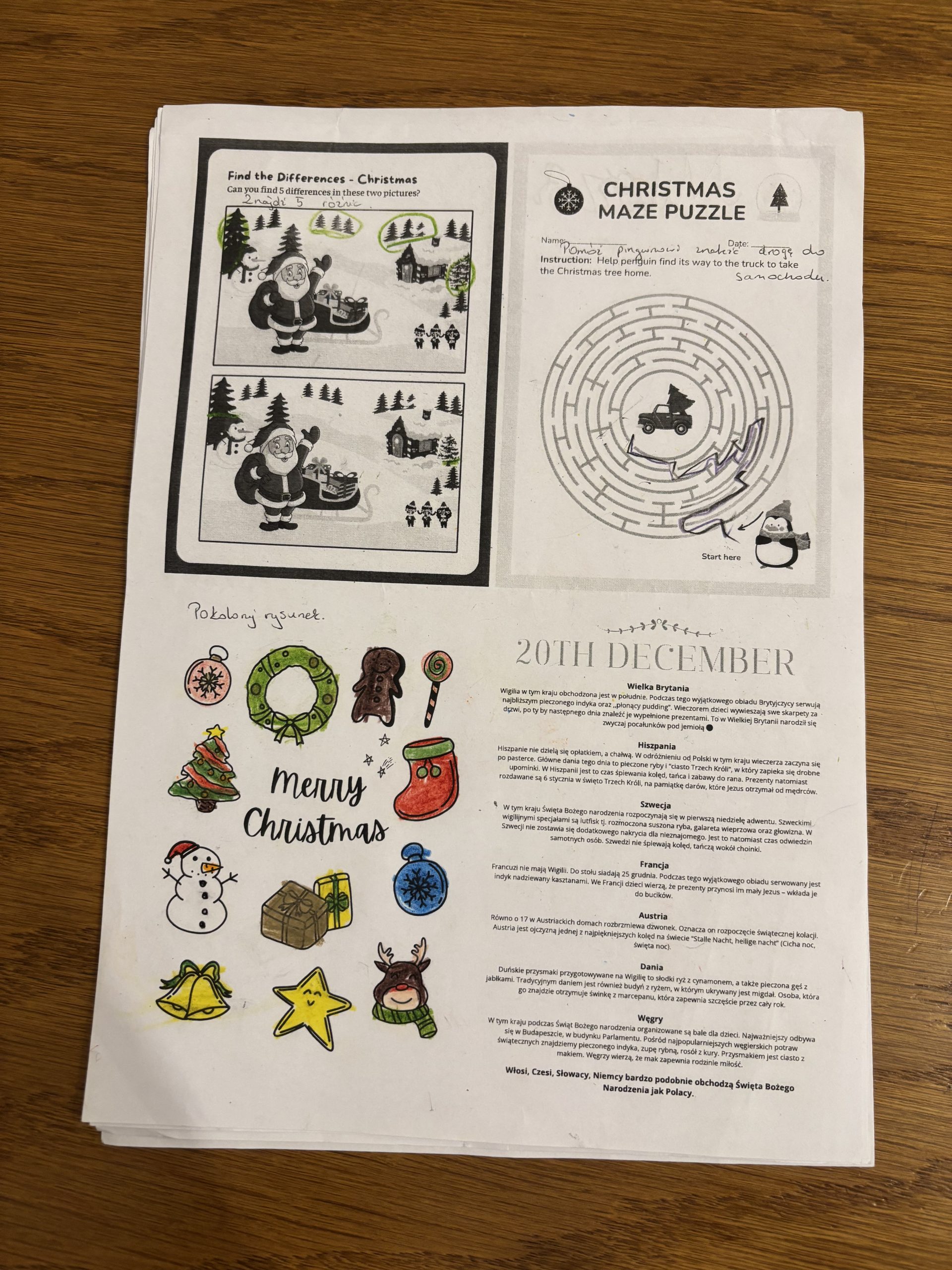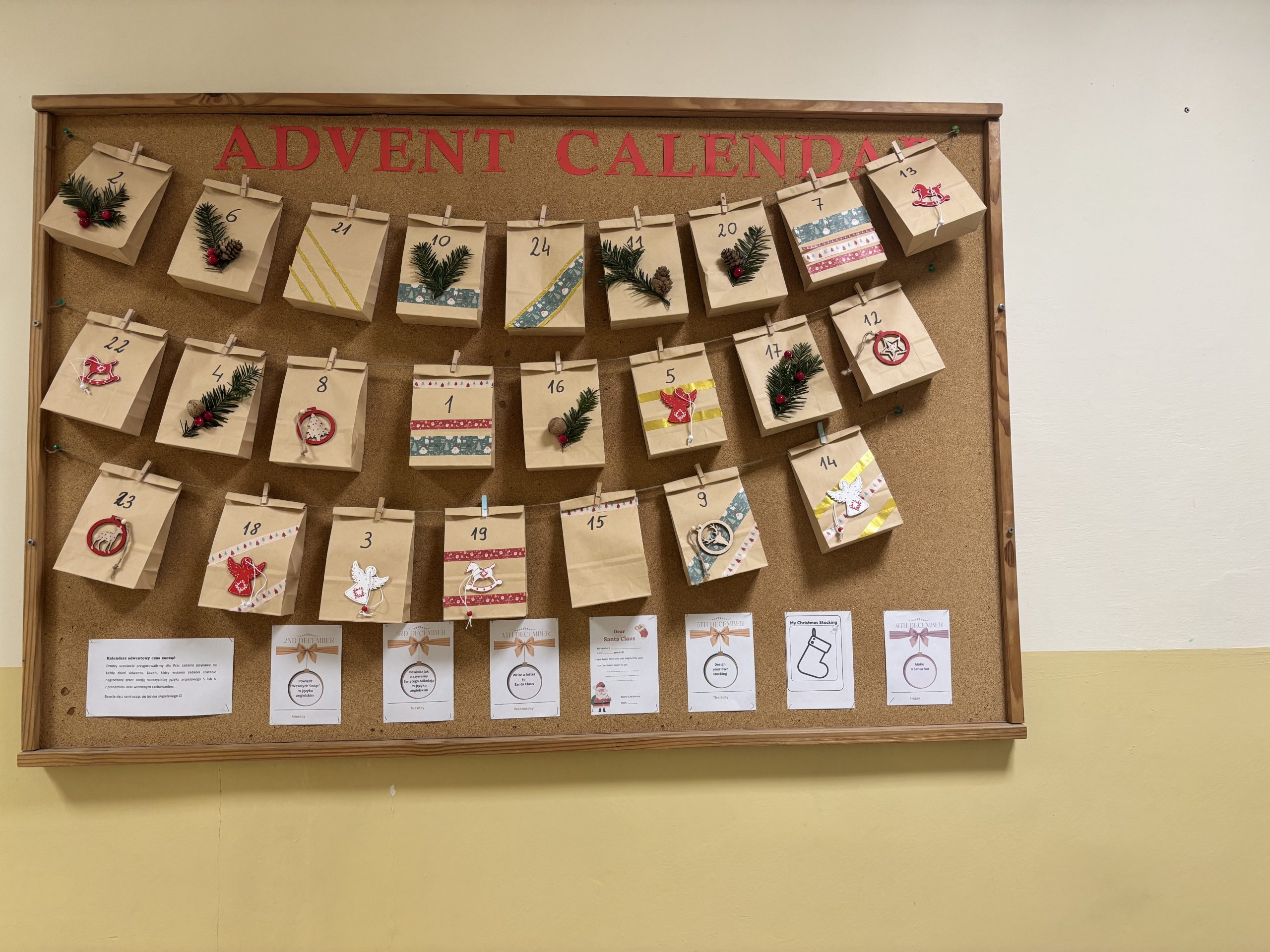 Nauczyciele języka angielskiego przygotowali na ten wyjątkowy czas kalendarz adwentowy dla najmłodszych uczniów. Kalendarz obejmuje zadania na poszczególne dni tygodnia. Tematyka ćwiczeń nawiązuje do Bożego Narodzenia. Dzieci wykonując kolejne zadania uczą się słownictwa świątecznego, składają życzenia bożonarodzeniowe, śpiewają kolędy oraz poznają zwyczaje bożonarodzeniowe innych krajów. Ponadto utrwalają nazwy liczebników i kolorów. Kalendarz cieszy się dużą popularnością wśród uczniów. Za swoją dodatkową pracę każdy uczeń otrzyma ocenę celującą z języka angielskiego oraz zachowanie wzorowe za udział w szkolnej zabawie.