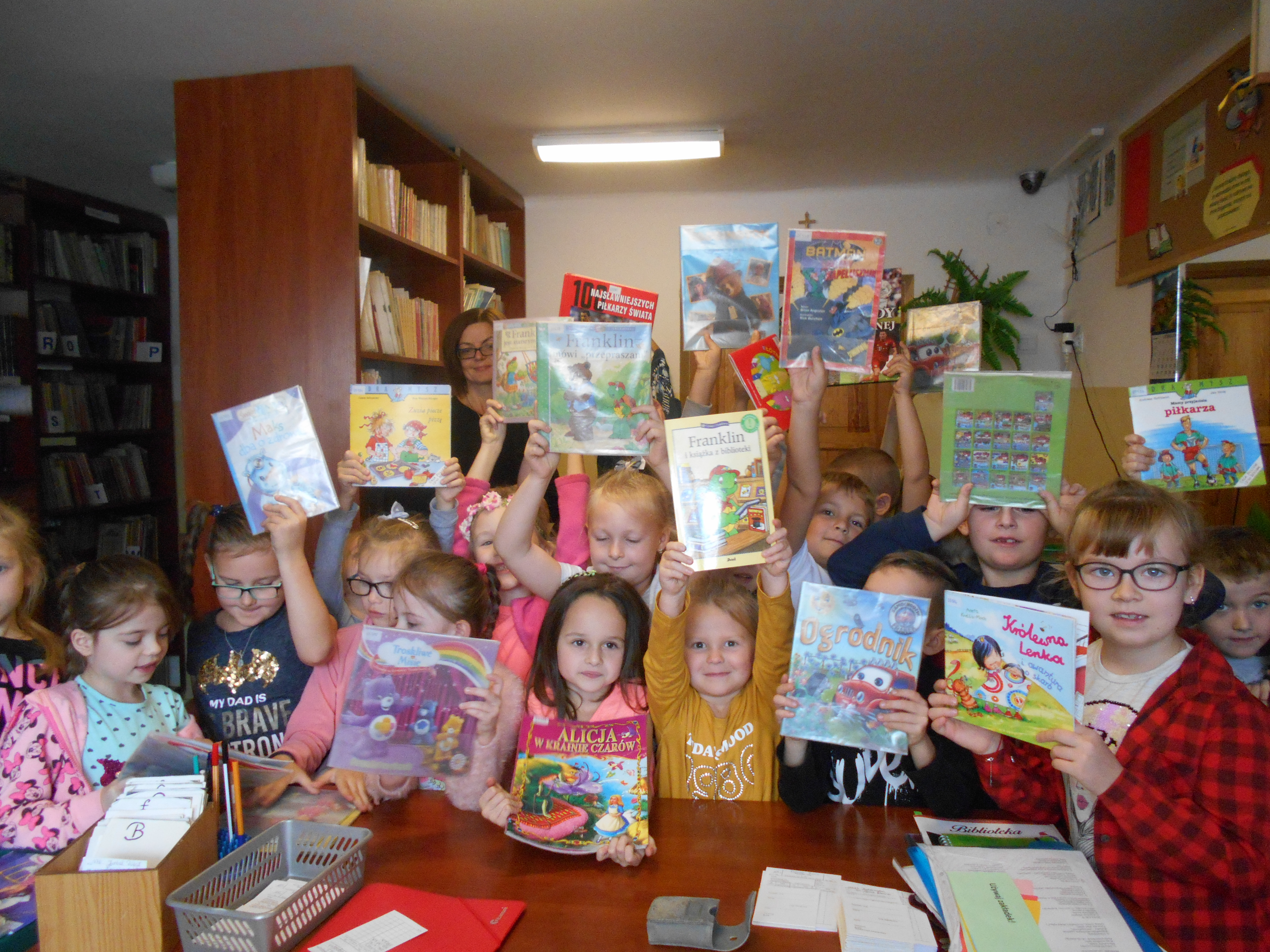 W październiku próg biblioteki szkolnej po raz pierwszy przekroczyły pierwszaki. Dzieci zostały zapoznane z regulaminem biblioteki, jej księgozbiorem, zasadami wypożyczania książek oraz właściwego korzystania z nich. Następnie dzieci wysłuchały historii o żółwiu Franklinie, który też chętnie odwiedzał bibliotekę, a potem mogły samodzielnie wypożyczyć swoje pierwsze książki. Na zakończenie wizyty każdy z uczniów otrzymał kolorowa zakładkę do książki.