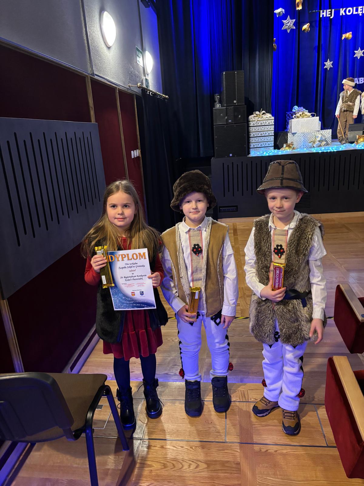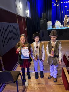 Sukces w Żabnie 19 stycznia 2025 / Trio wokalne naszej szkoły w składzie Iga Urban, Franciszek Czapliński i Sergiusz Dębosz wyśpiewało I miejsce w 29 Konkursie Kolęd i Pastorałek w Żabnie. Zespół wykonał utwór pt. „Osiołek”.Posłuchajmy: