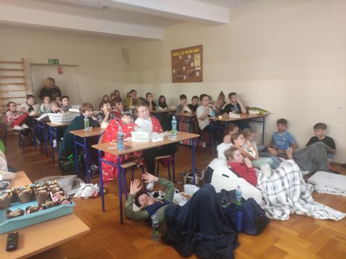 Uczniowie klas V mieli okazję spędzić wieczór mikołajkowy w szkole. Spotkanie miało formę zajęć integracyjnych odbywających się w godzinach wieczornych na terenie szkoły. W programie znalazły się m.in.: rozgrywki sportowe, gry towarzyskie i planszowe, oglądanie filmu o tematyce mikołajkowej oraz wspólny posiłek. Zaproponowane aktywności sprzyjały budowaniu relacji rówieśniczych, rozwijaniu umiejętności współpracy oraz kształtowaniu zasad fair play. Uczniowie aktywnie uczestniczyli w zaplanowanych działaniach, wykazując zaangażowanie oraz otwartość na współdziałanie z rówieśnikami. Wspólnie spędzony czas w mniej formalnej atmosferze sprzyjał wzajemnemu poznaniu się oraz budowaniu pozytywnych relacji.