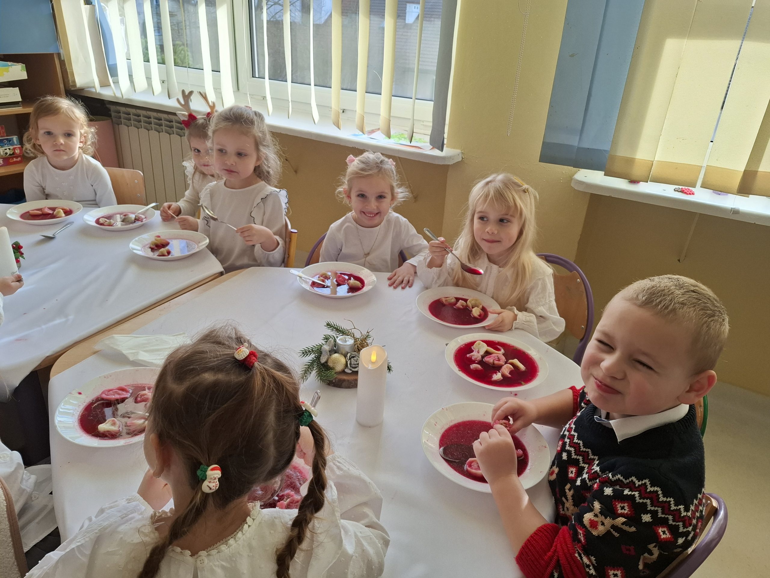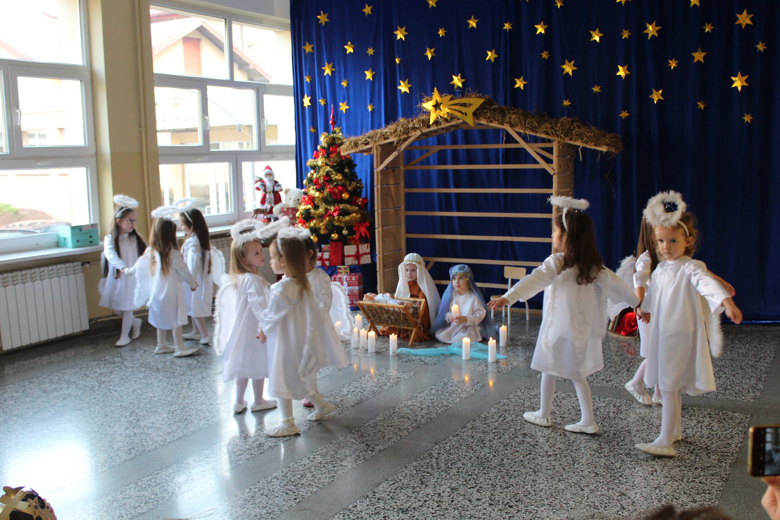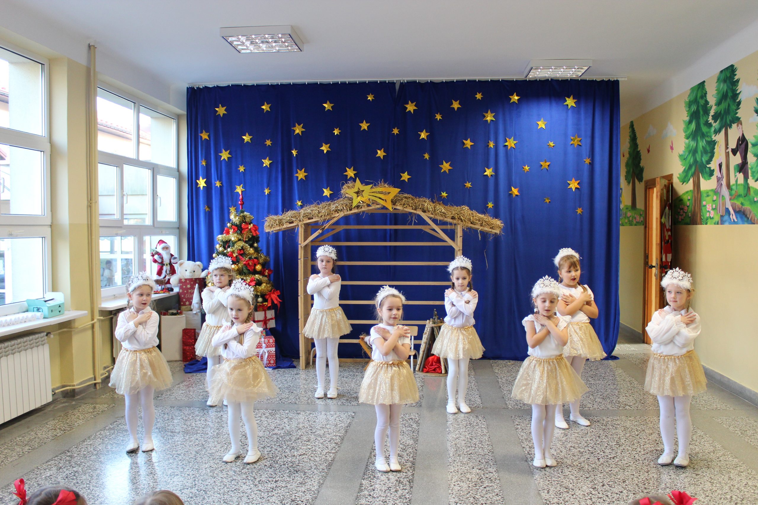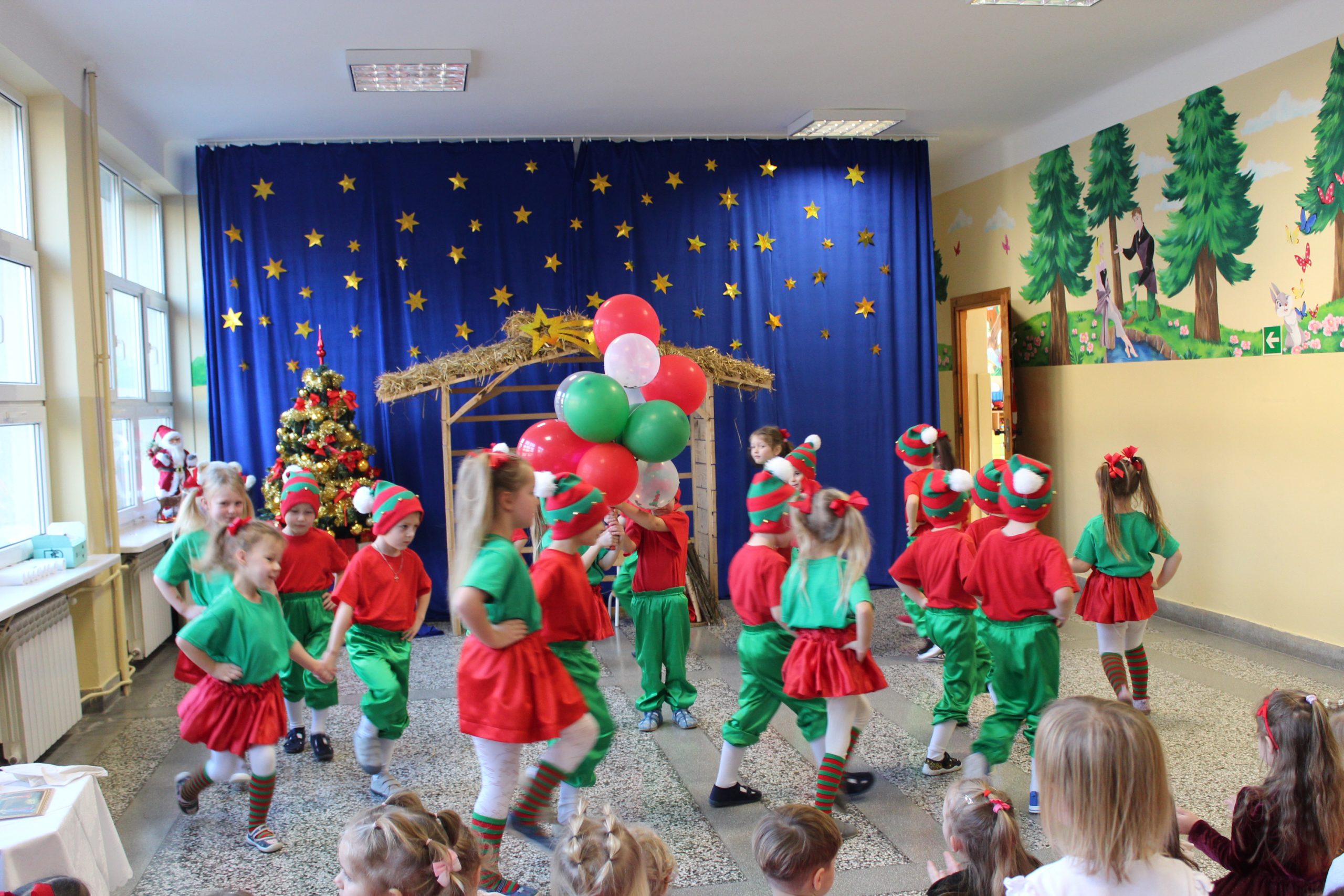 18 grudnia 2025 r. w naszym przedszkolu miało miejsce bożonarodzeniowe przedstawienie, które wprowadziło zgromadzonych w wyjątkowy, świąteczny nastrój. W jasełkach udział wzięły przedszkolaki z grupy II, IV i V. Nasi mali aktorzy z dużym zaangażowaniem wcielili się w role Maryi, Józefa, aniołów, pasterzy oraz Trzech Króli. Na scenie pojawiły się też świąteczne elfy oraz śnieżne wróżki. W trakcie występu dzieci zaprezentowały tańce, recytację wierszy, śpiew kolęd i pastorałek, a także odegrały krótkie scenki nawiązujące do narodzenia Jezusa. Całość dopełniały starannie przygotowane stroje oraz świąteczna dekoracja sali, które podkreśliły uroczysty charakter wydarzenia. Punktem kulminacyjnym była wspólna modlitwa, a następnie łamanie się opłatkiem i wigilijny obiad.