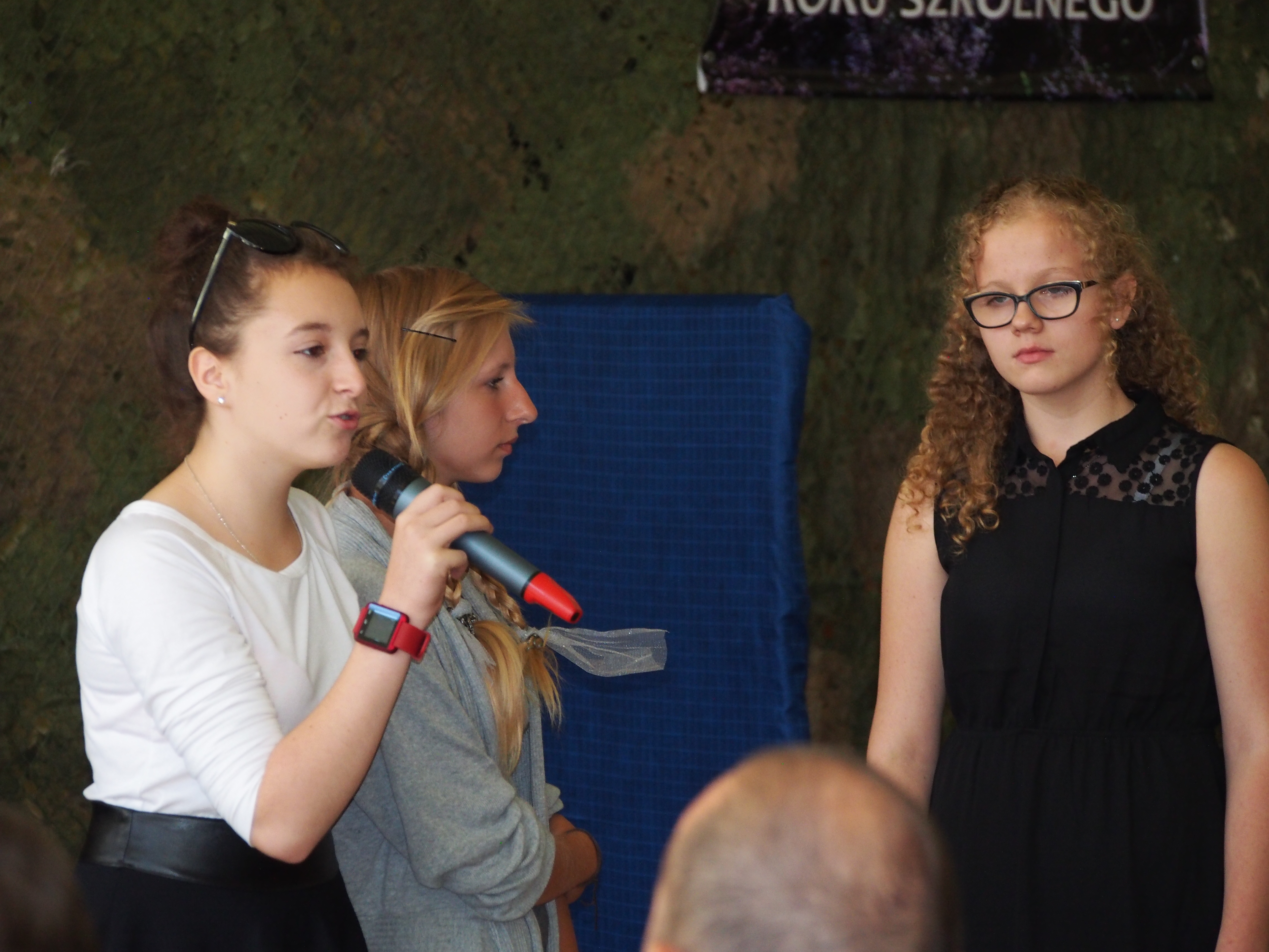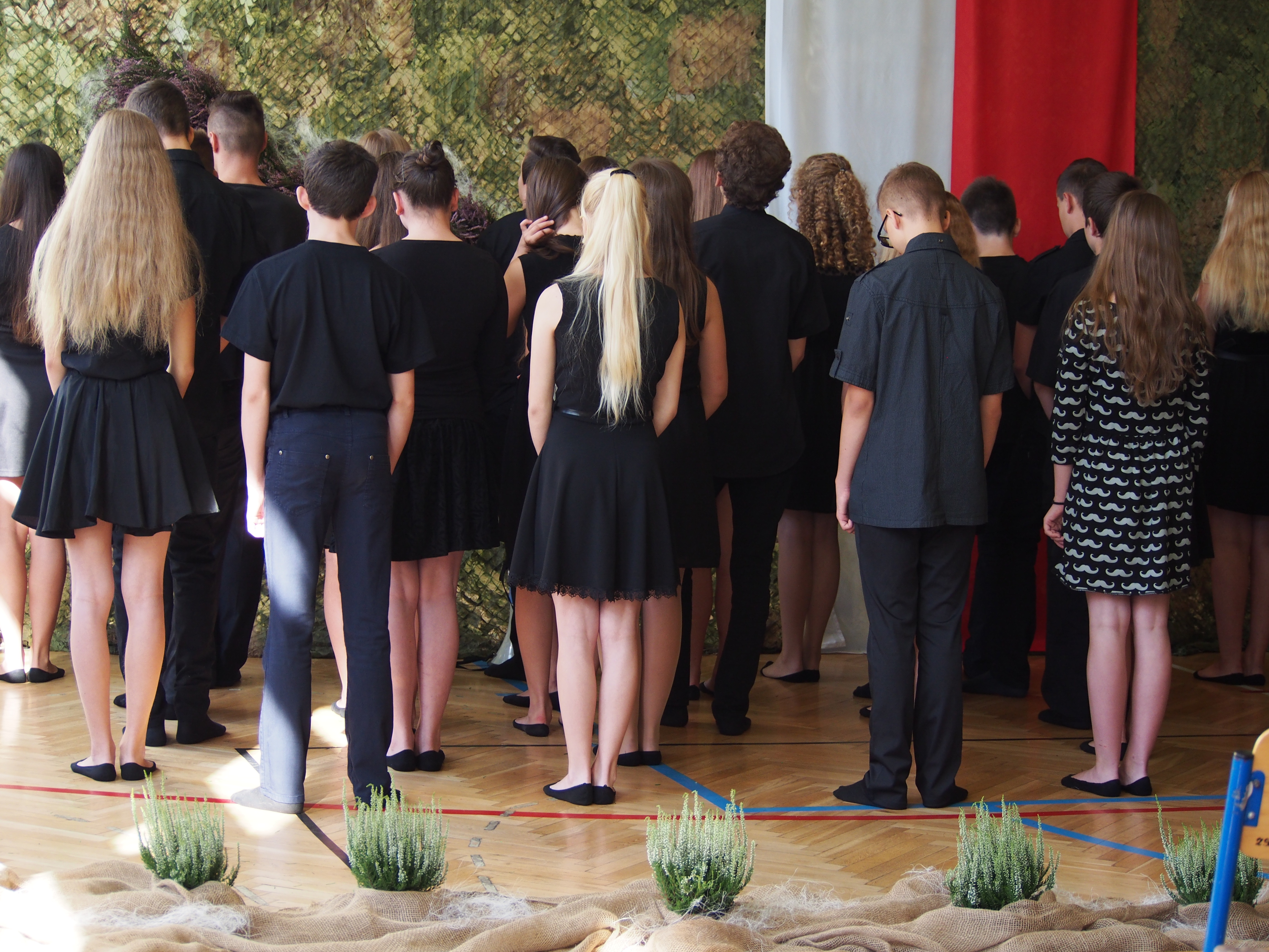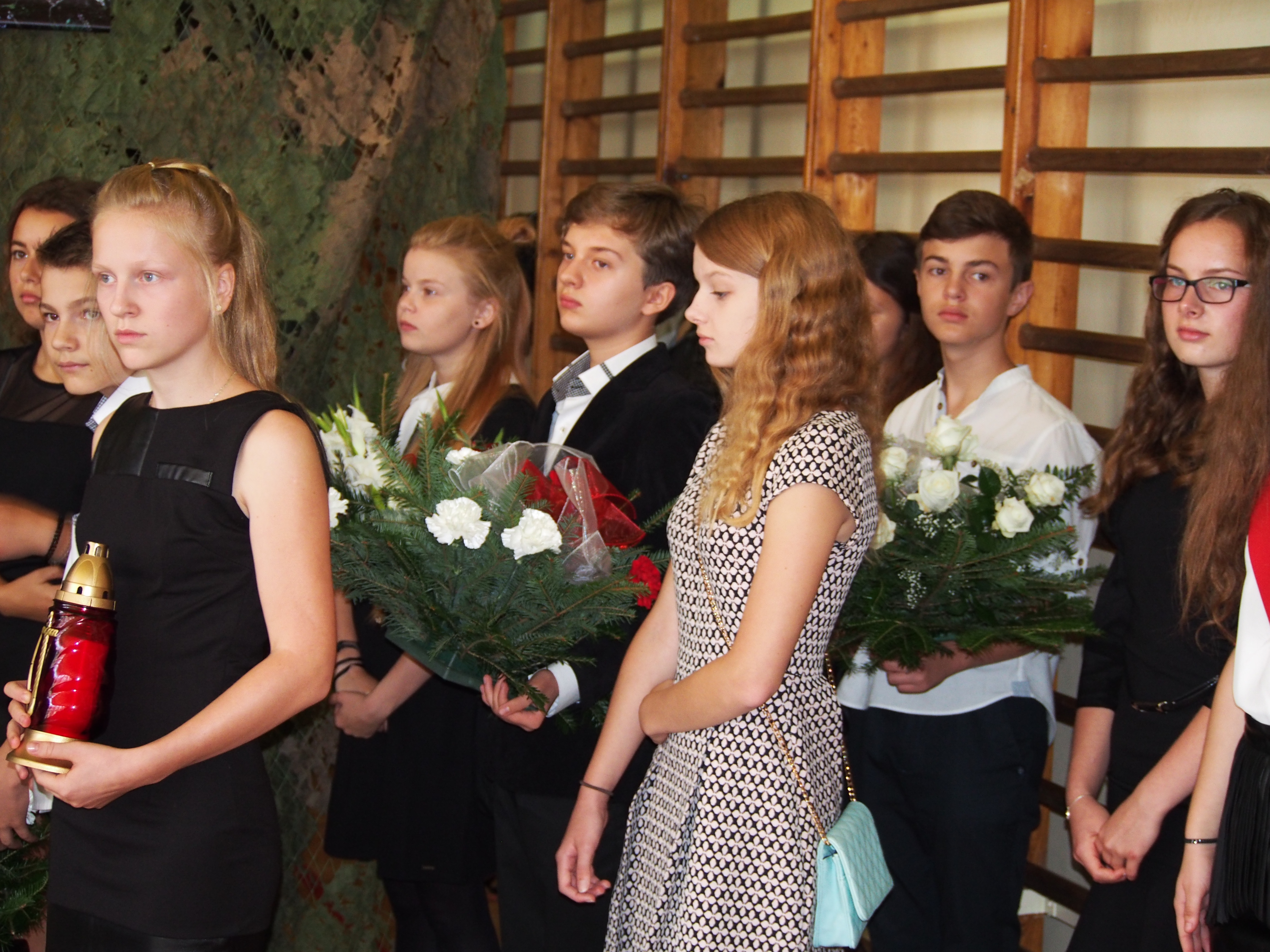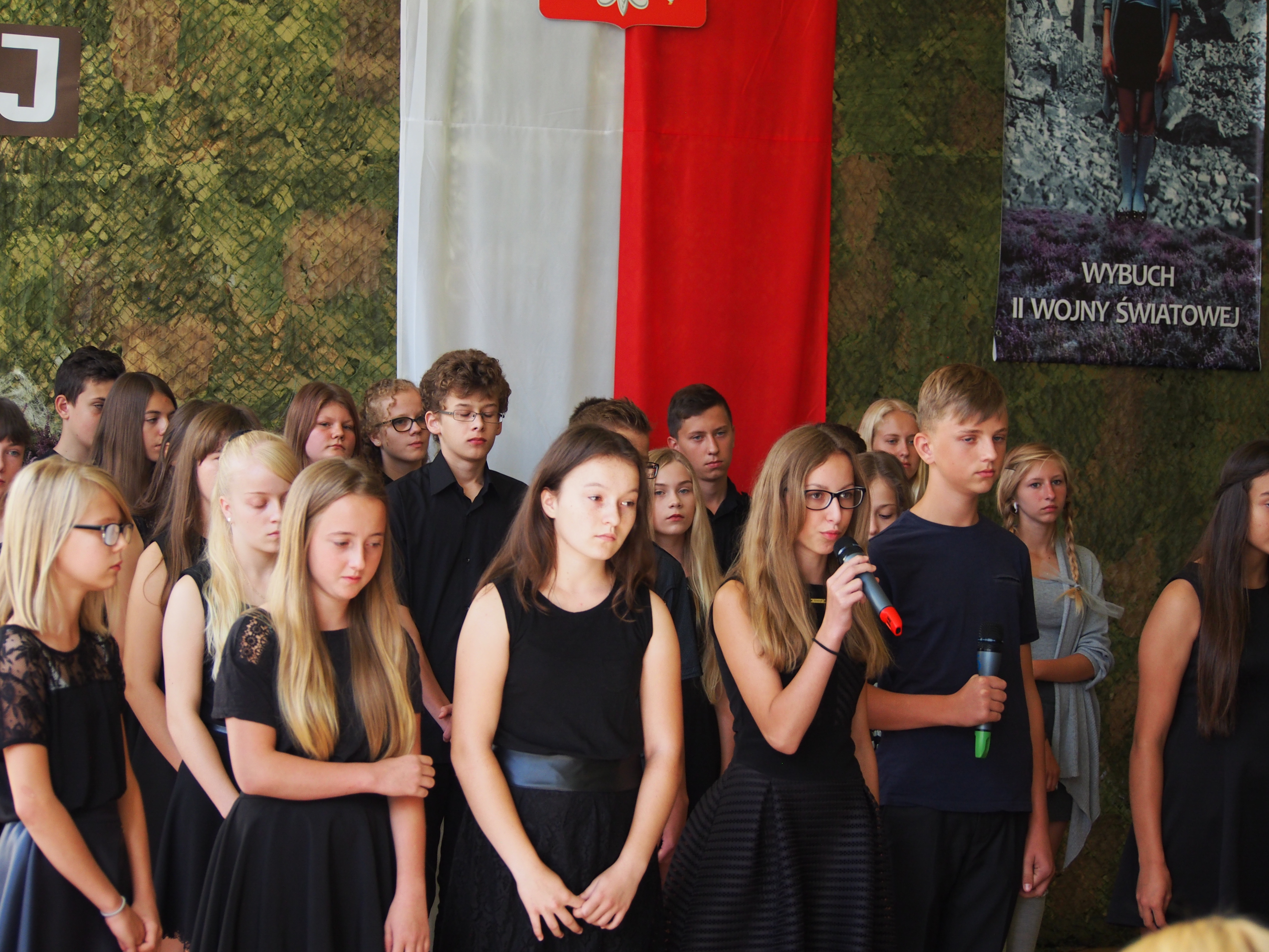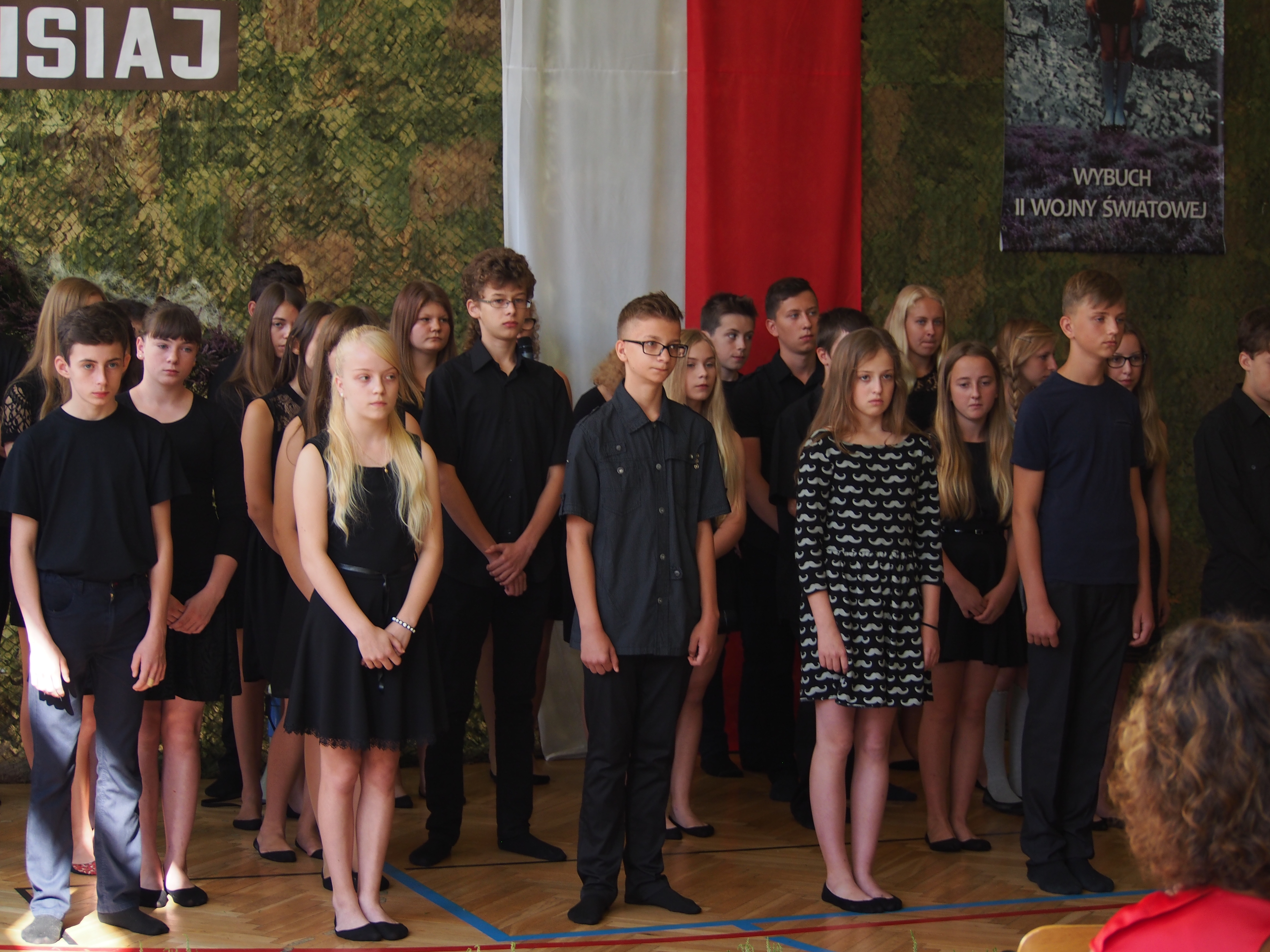 Uczniowie, rodzice, zaproszeni goście oraz dyrekcja i nauczyciele w skupieniu wysłuchali programu artystyczno – patriotycznego nawiązującego do 77. rocznicy wybuchu II wojny światowej. Występ przygotowały klasy II gimnazjum pod kierunkiem wychowawców – Ewy Wajdy, Haliny Kras i Agnieszki Stachoń. Niespodzianką było wręczenie przez goszczącego na uroczystości wicestarostę tarnowskiego p. Zbigniewa Karcińskiego plecaków – wyprawek szkolnych. Otrzymali je wylosowani uczniowie szkoły podstawowej i gimnazjum.