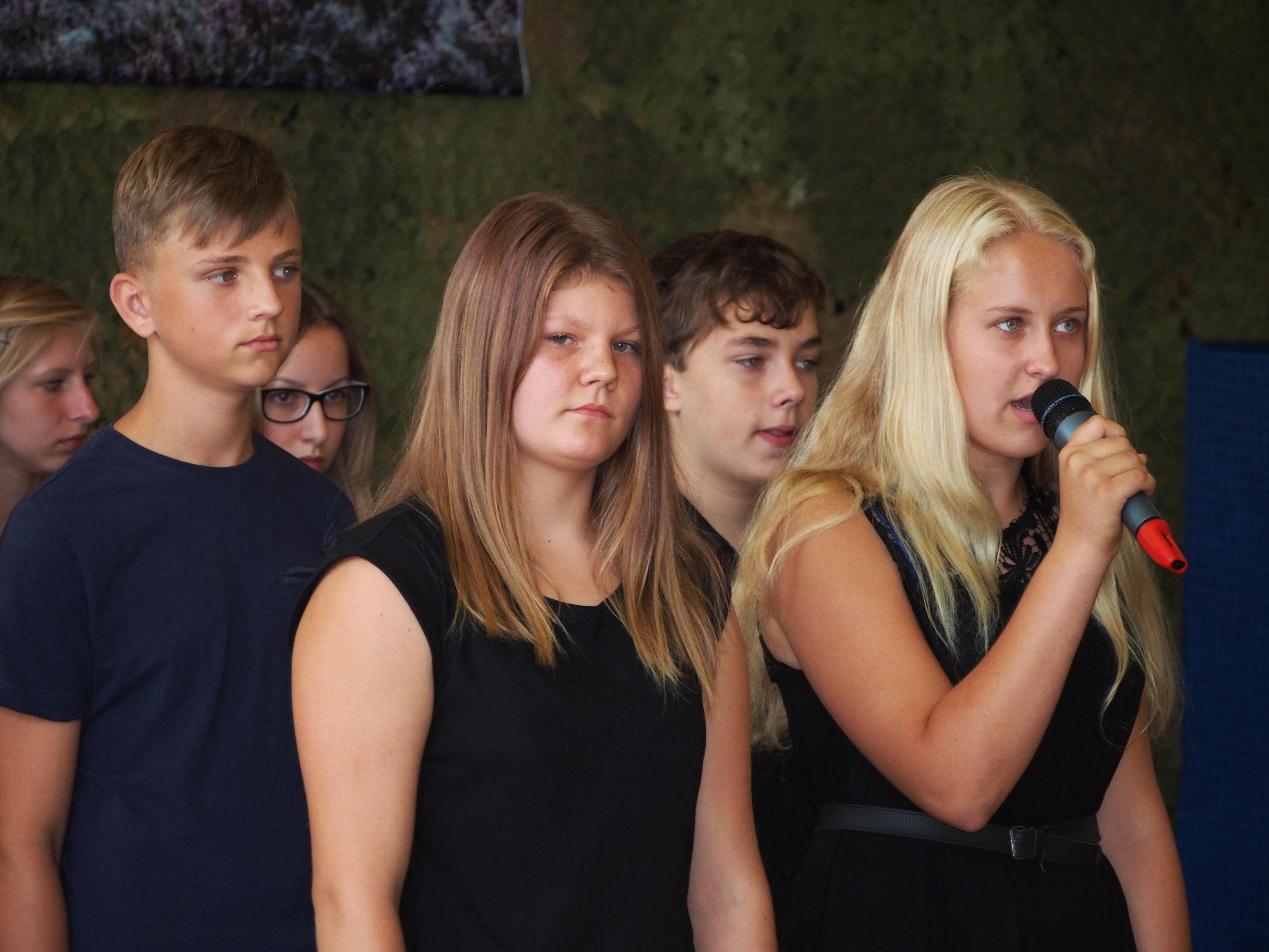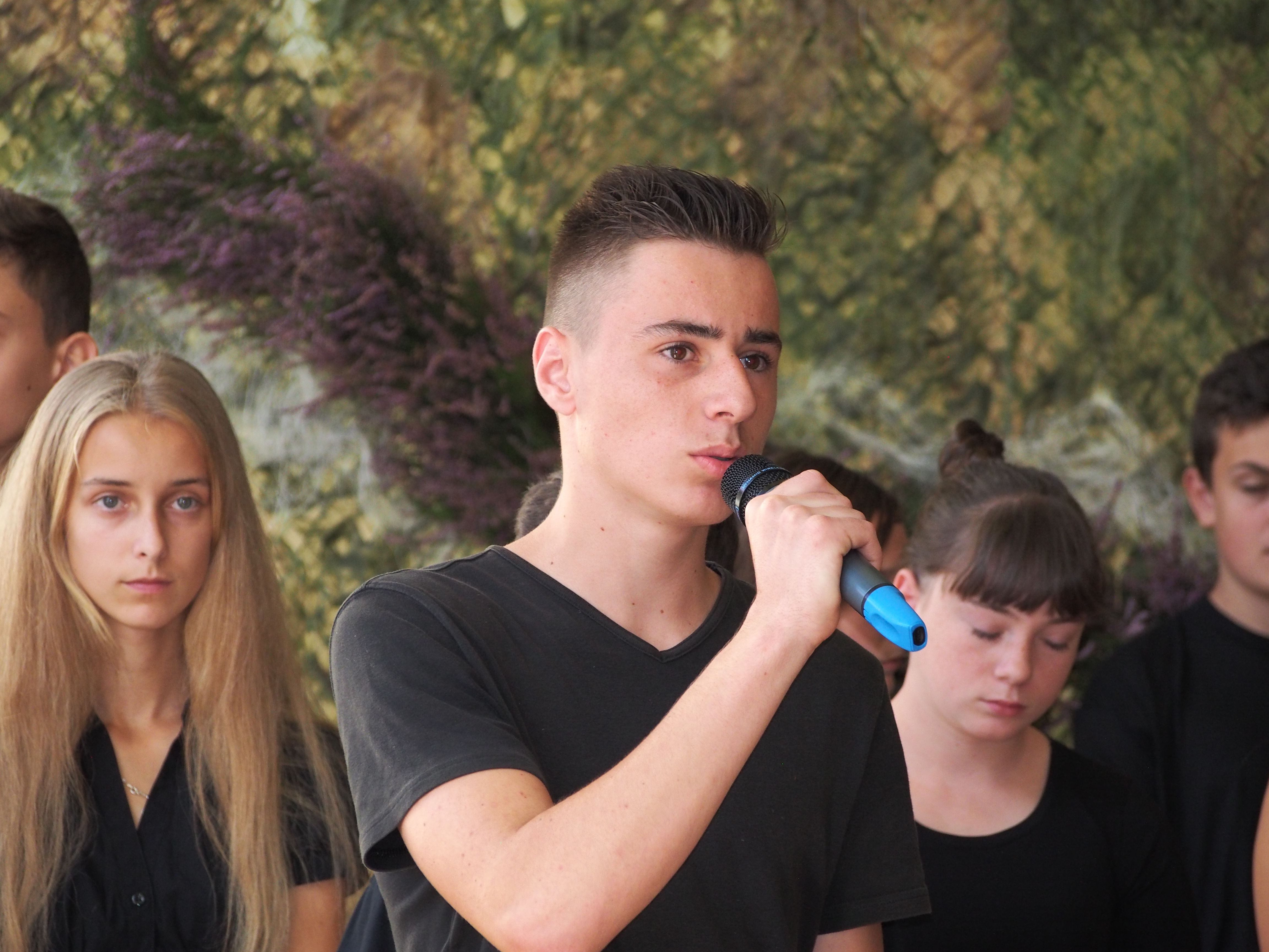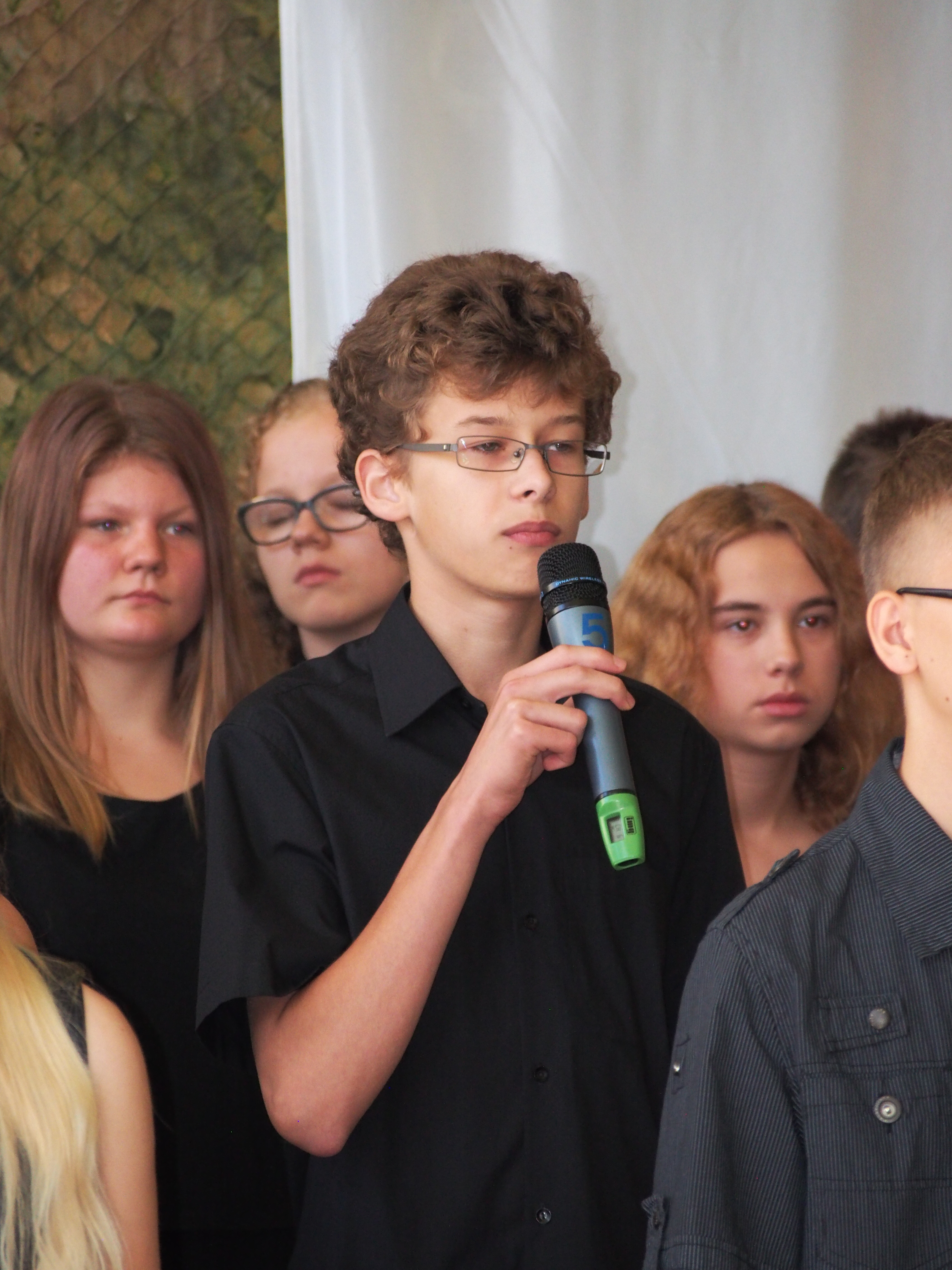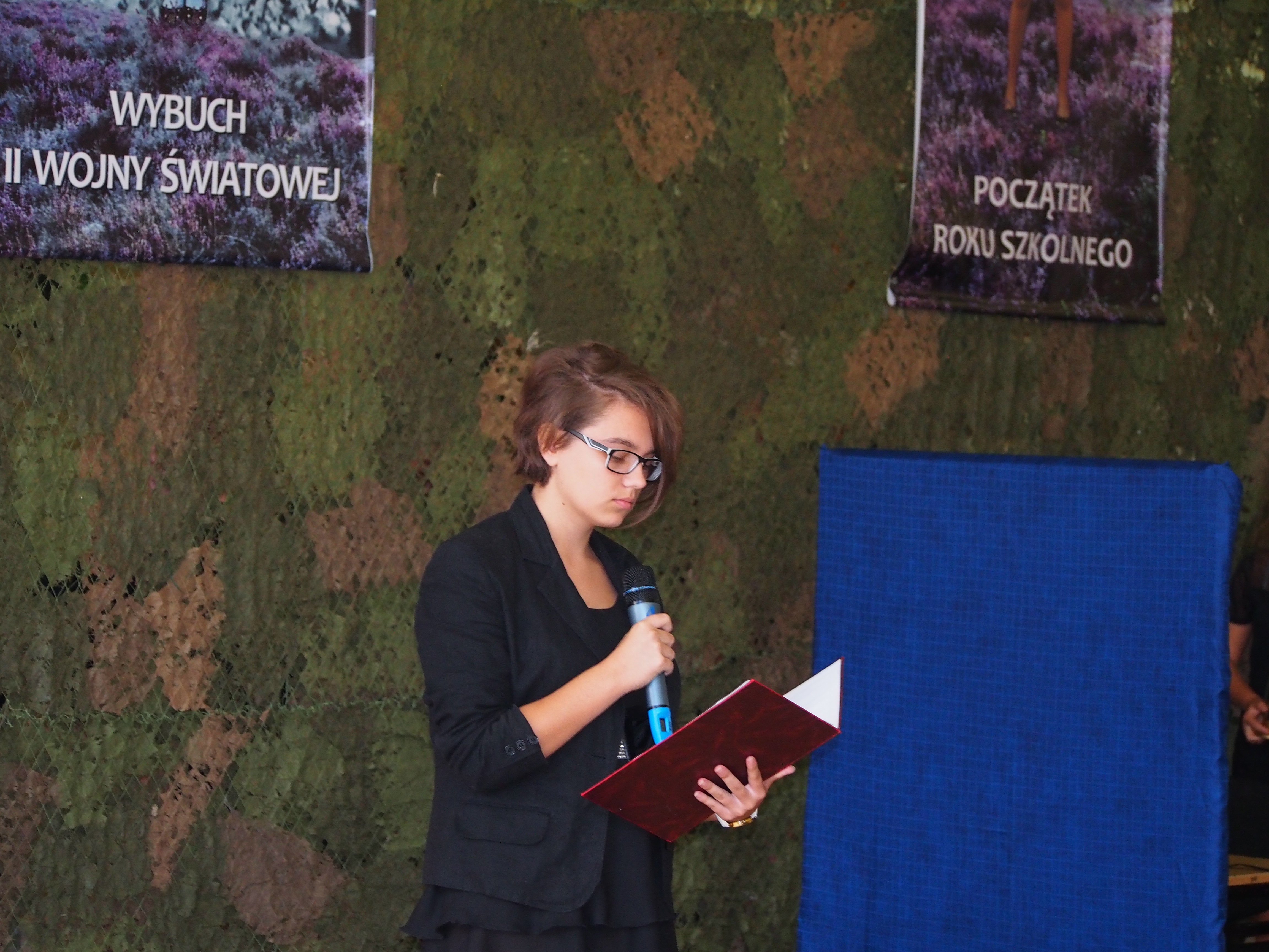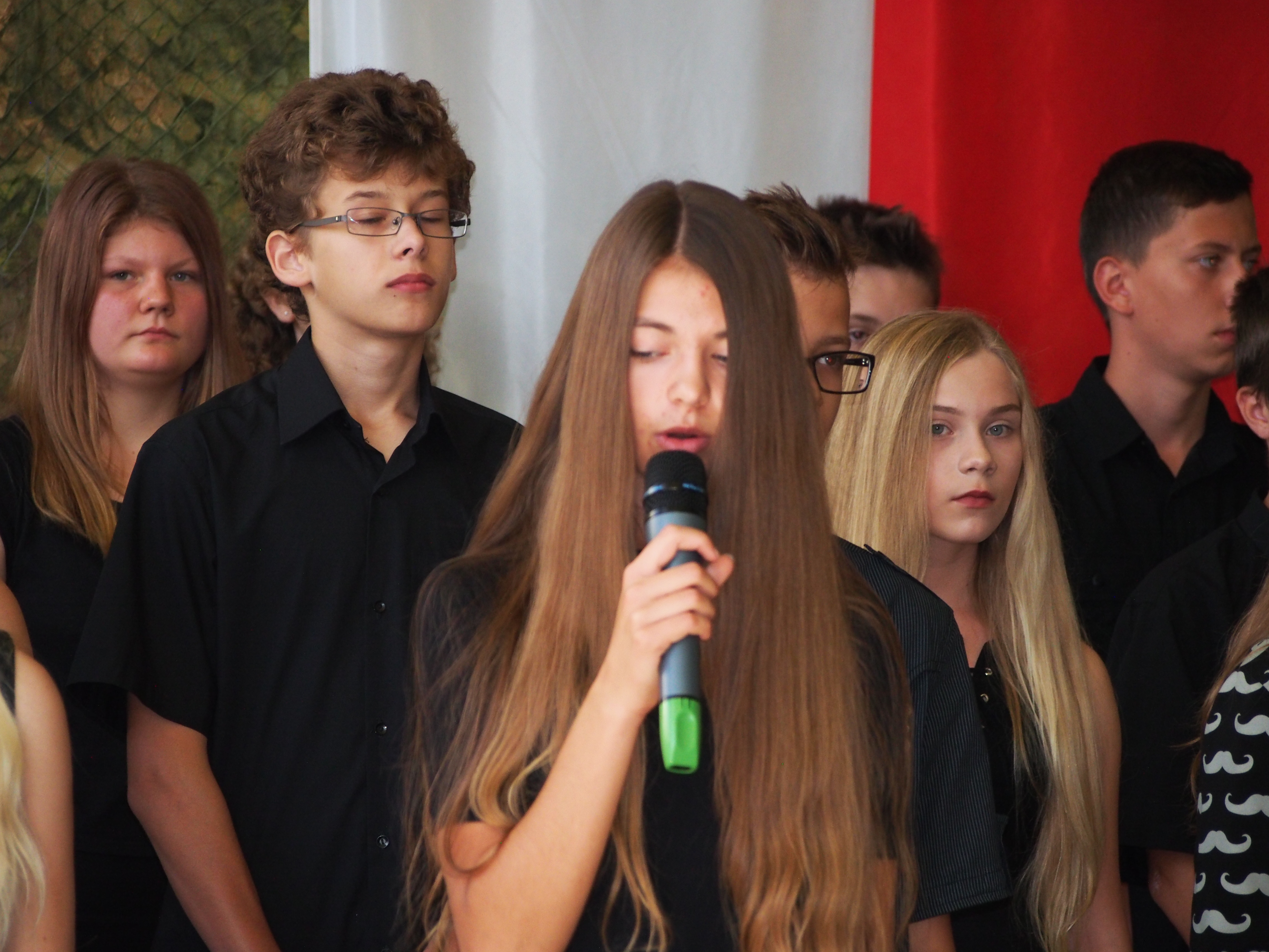 Uczniowie, rodzice, zaproszeni goście oraz dyrekcja i nauczyciele w skupieniu wysłuchali programu artystyczno – patriotycznego nawiązującego do 77. rocznicy wybuchu II wojny światowej. Występ przygotowały klasy II gimnazjum pod kierunkiem wychowawców – Ewy Wajdy, Haliny Kras i Agnieszki Stachoń. Niespodzianką było wręczenie przez goszczącego na uroczystości wicestarostę tarnowskiego p. Zbigniewa Karcińskiego plecaków – wyprawek szkolnych. Otrzymali je wylosowani uczniowie szkoły podstawowej i gimnazjum.