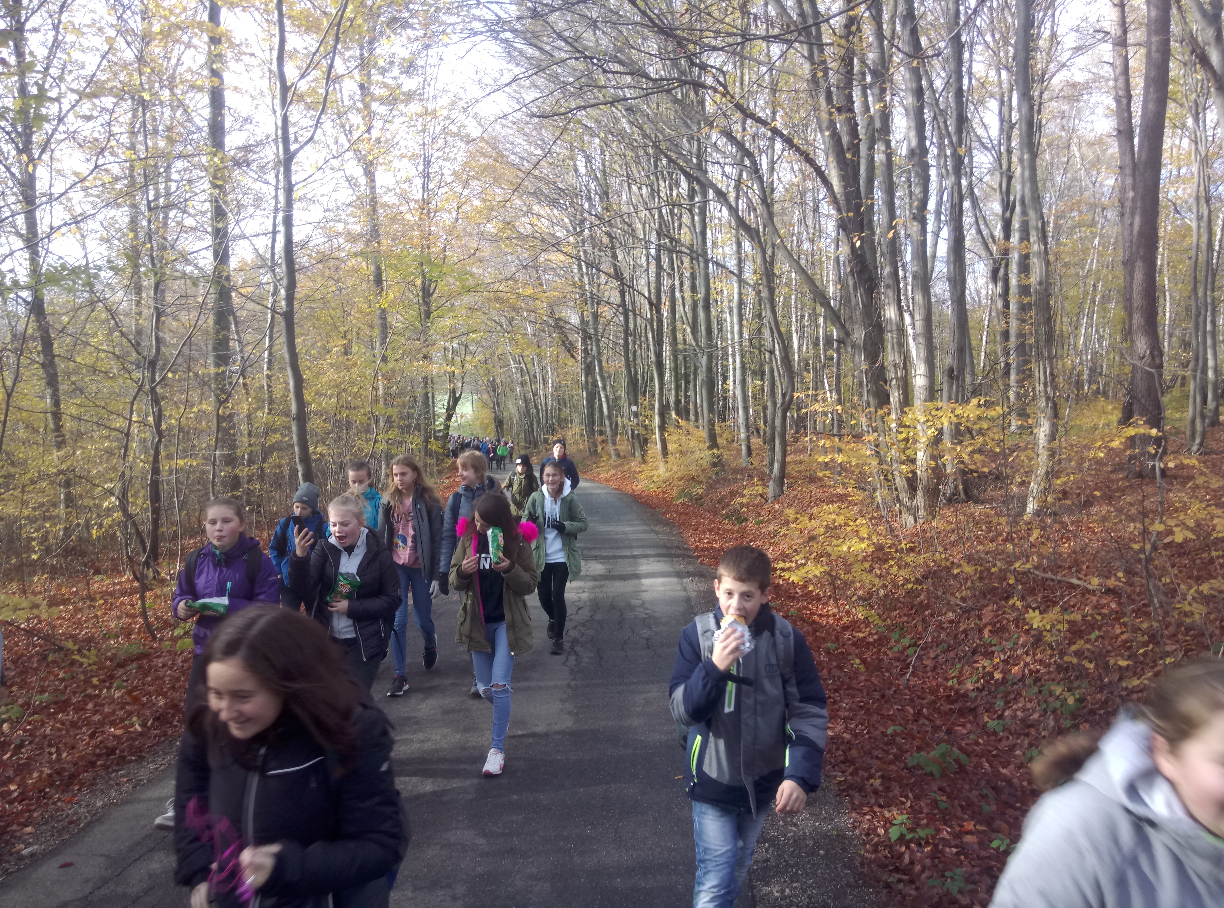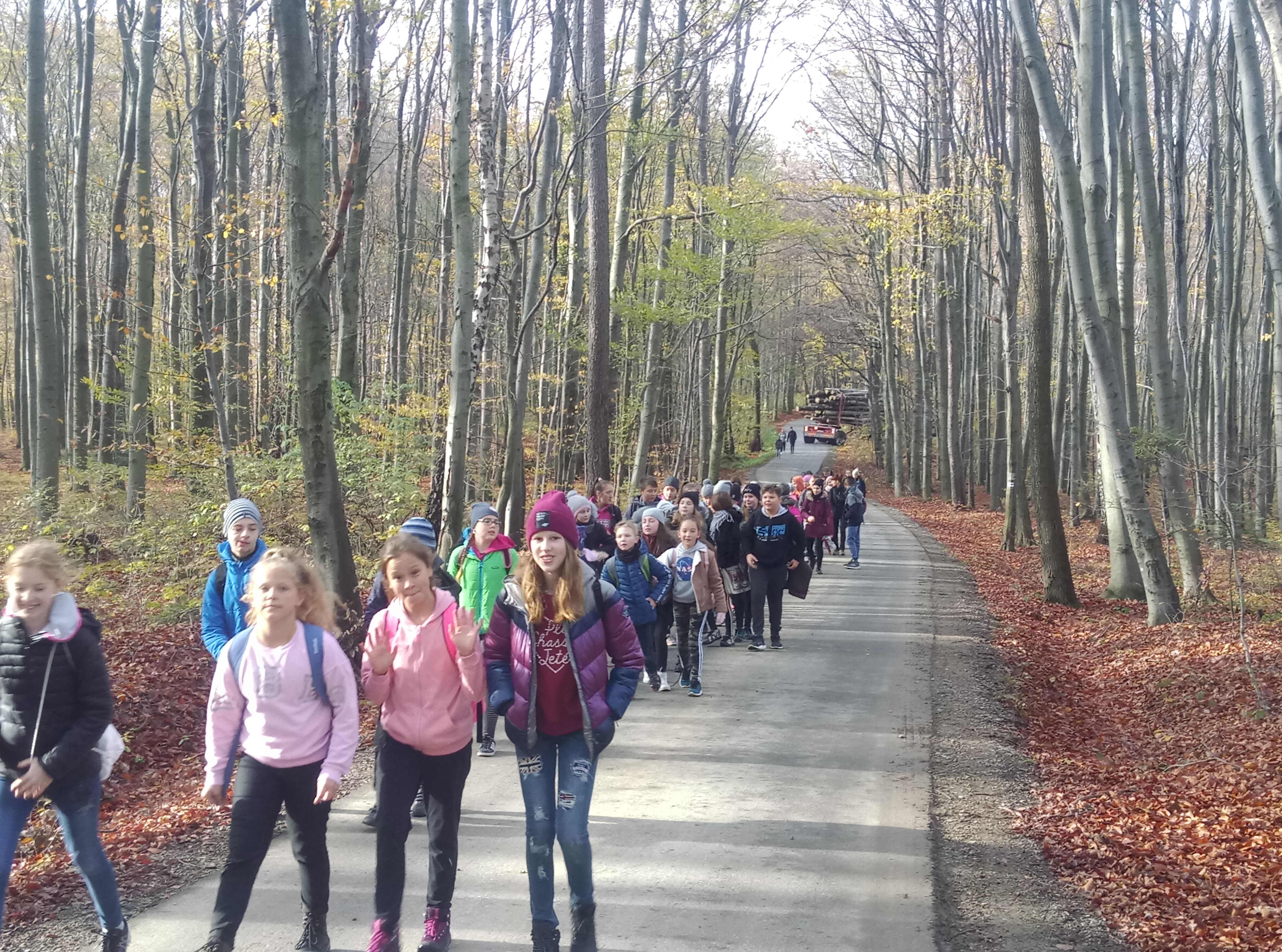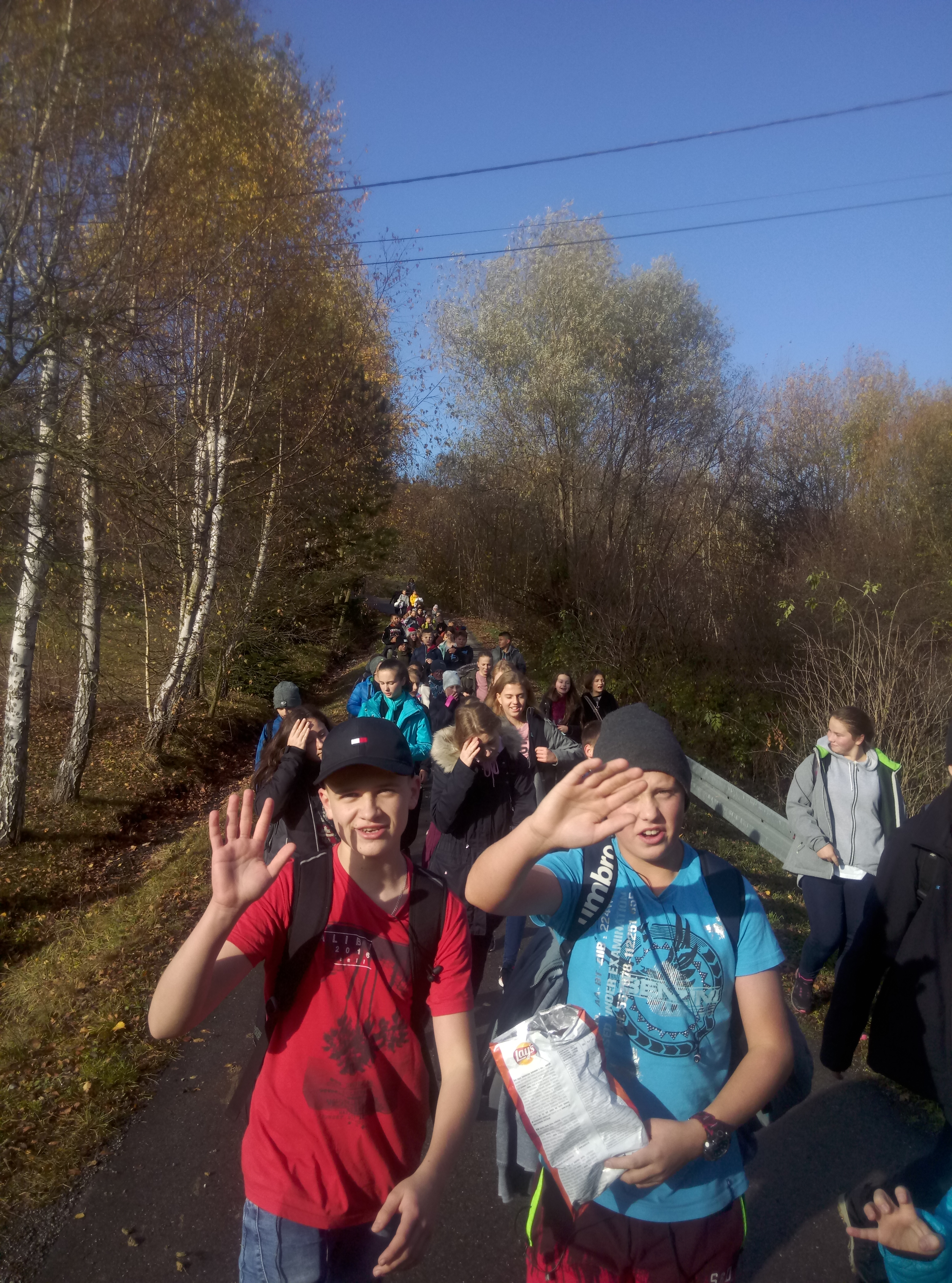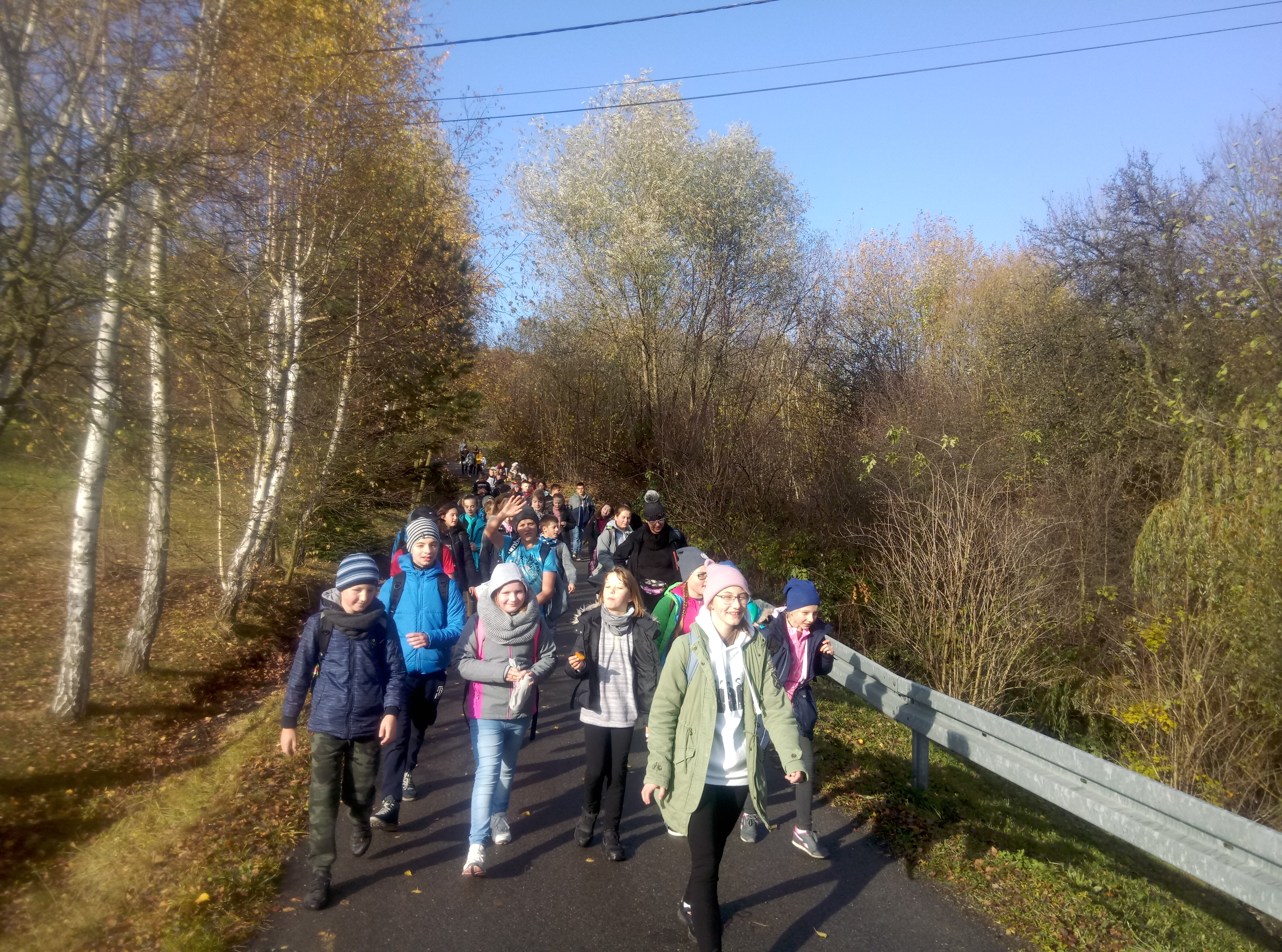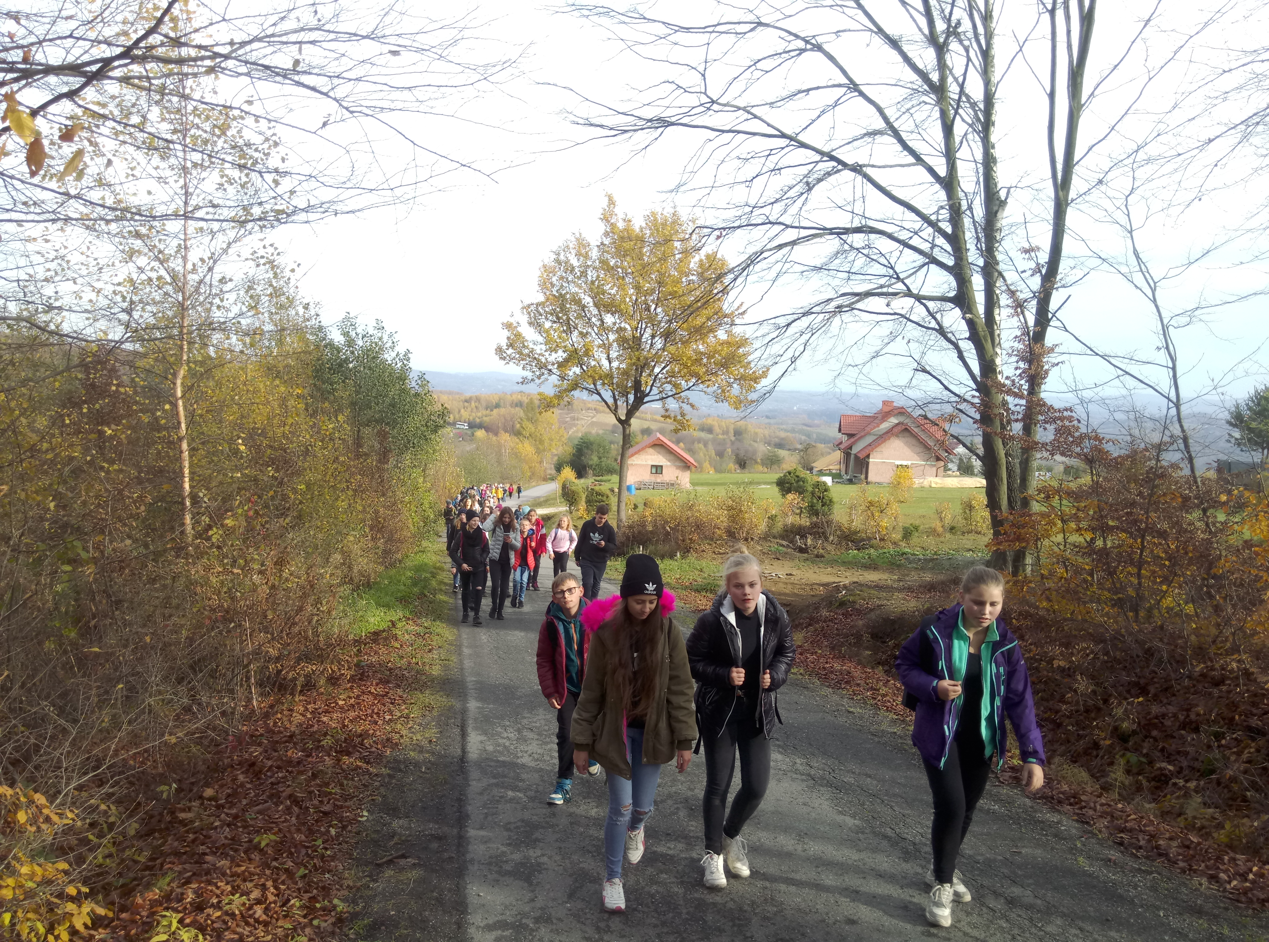 Dzień kolejny, 8 listopada, upłynął dla większości uczniów starszych klas pod hasłem „rajdu do Łowczówka”. Tradycyjnie już uczestniczyliśmy w Małopolskim Złazie Patriotyczno – Turystycznym „Szlakami Legionistów”, którego celem był najważniejszy w okolicy cmentarz wojskowy z okresu I wojny światowej. Uwieńczeniem kilkunastokilometrowej wędrówki był udział we wspólnej modlitwie i zadumie nad wydarzeniami sprzed ponad wieku i ofierze Legionistów – patriotów, którym dziś zawdzięczamy wolność i niepodległość. Na końcu akcent najprzyjemniejszy, czyli rozstrzygnięcie rajdowych konkursów. Nie było zbytnim zaskoczeniem, że puchar za najliczniejszy (138 – osobowy, plus opiekunowie) udział trafi w ręce przedstawicieli… Szkoły Podstawowej w Gromniku! Uznanie zyskał również nasz wieniec nagrobny, który ostatecznie sklasyfikowany został na III miejscu.
