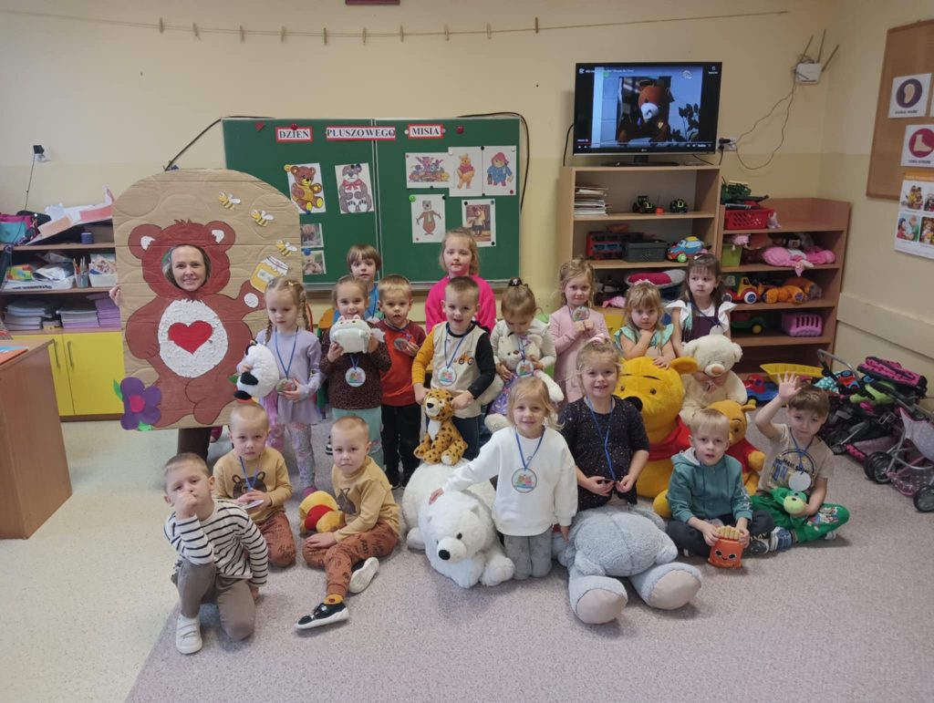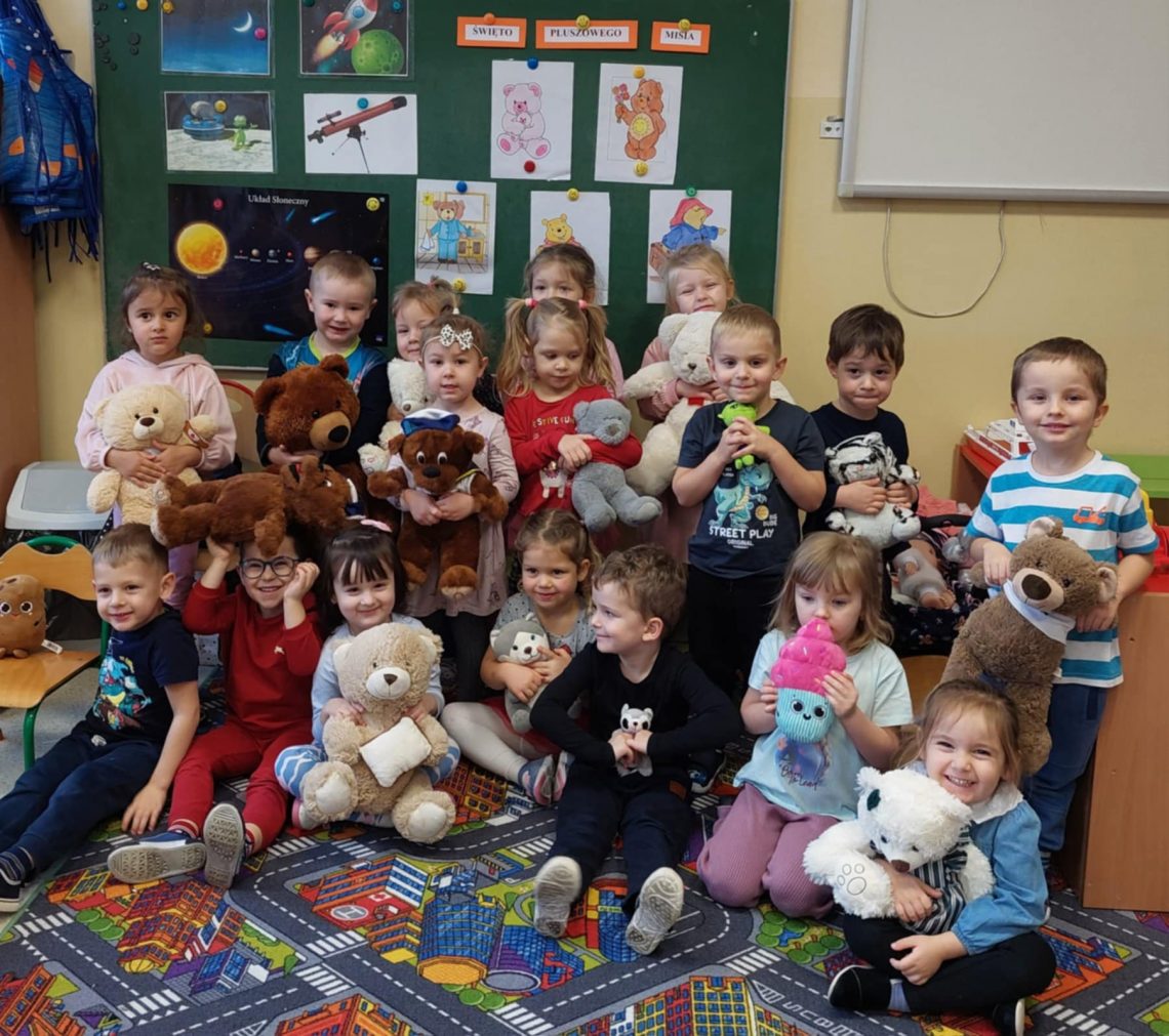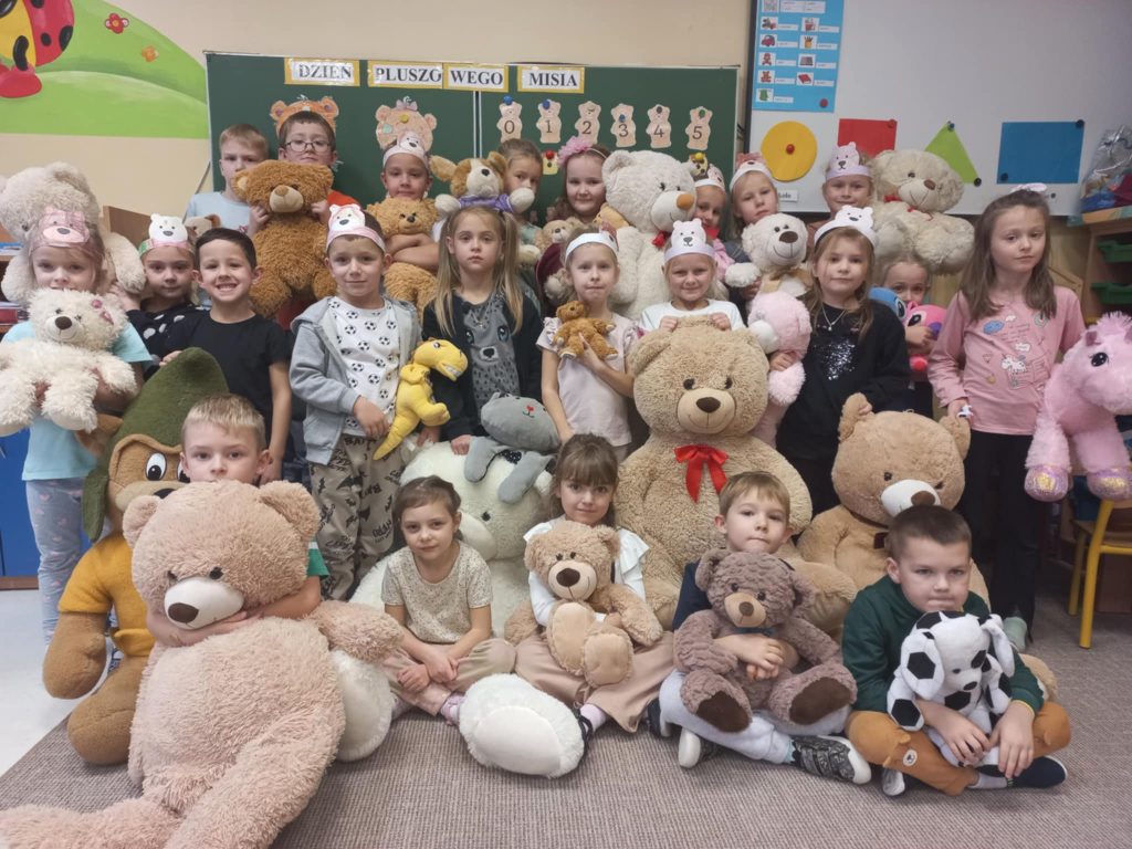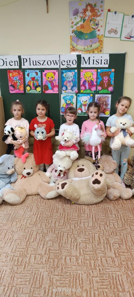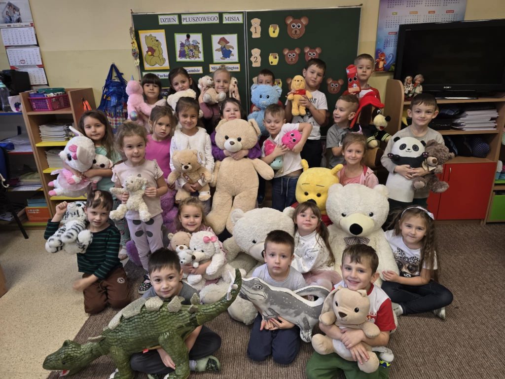 Dnia 22.11.2024r. w piątek do przedszkola przybyły misie: małe, średnie i bardzo duże, białe brązowe, zielone itd. A każdy był piękny i wyjątkowy jak jego właściciel. Przedszkolaki zostały zaproszone do wspólnej zabawy w misiowej krainie. Poznały historię święta, bawiły się przy znanych misiowych piosenkach: „Dwa malutkie misie”, „Jadą, jadą misie”. Powstało wiele ciekawych prac plastycznych, które oczywiście przedstawiały misie. Ten dzień w przedszkolu był pełen uśmiechu oraz wspólnej zabawy. Jednak najwięcej radości sprawił dzieciom sam fakt zaprezentowania swojego misia kolegom i możliwość zabawy z pluszakiem. Dla najmłodszych zabawa była tak wyczerpująca, że miś utulił dzieci po obiedzie do snu.