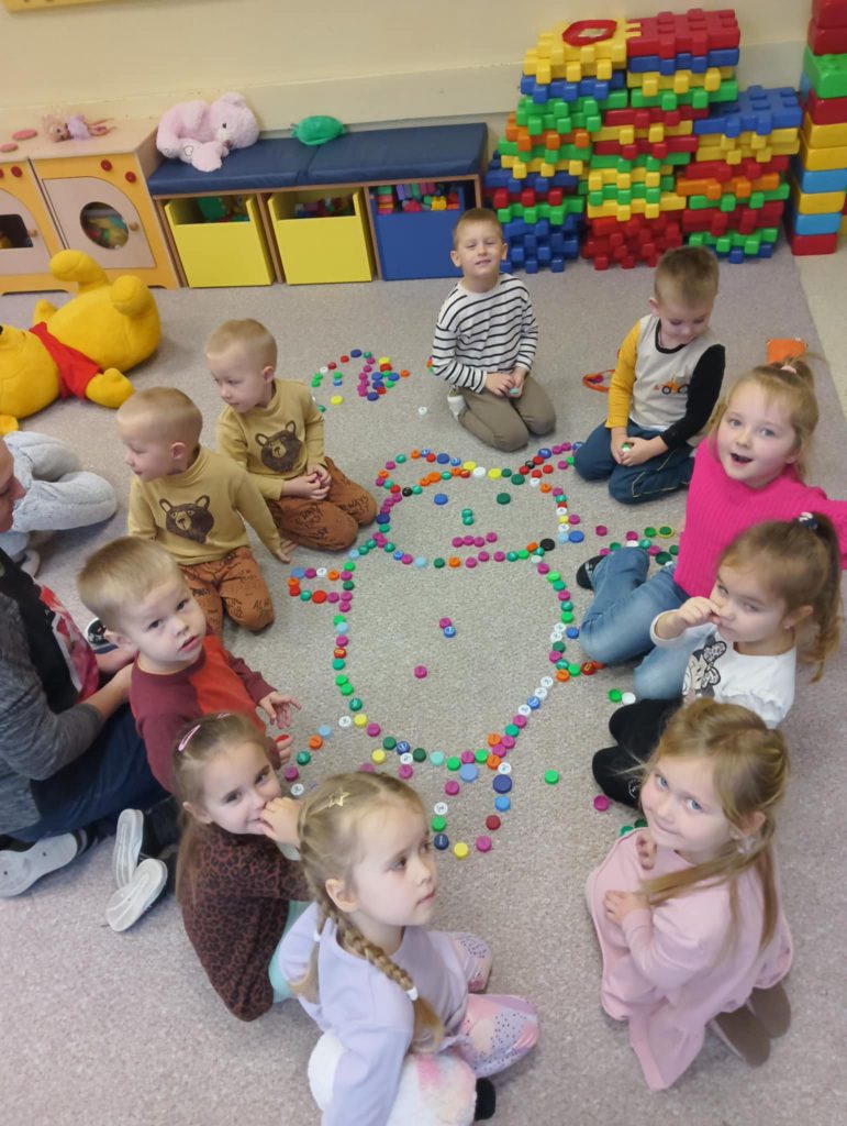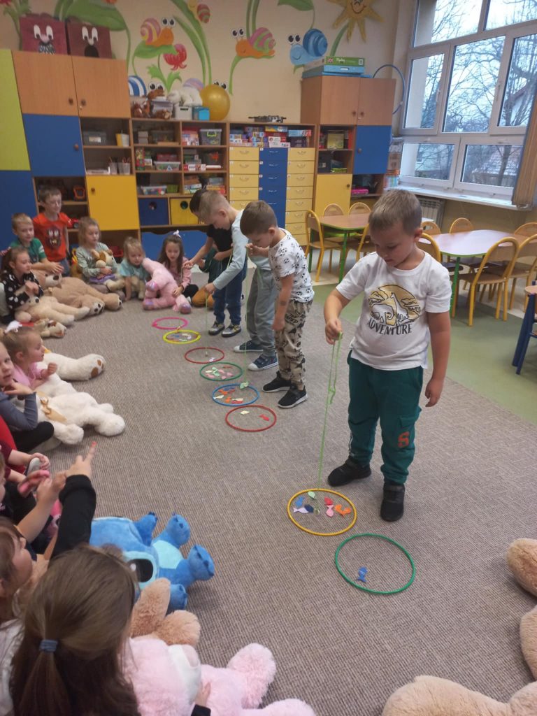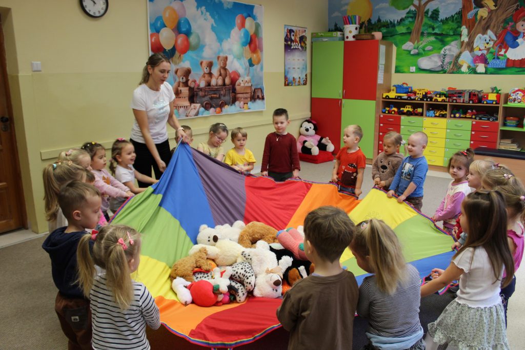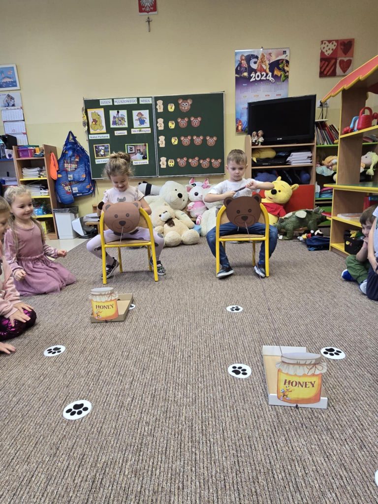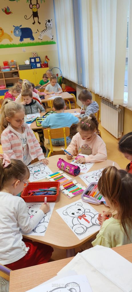 Dnia 22.11.2024r. w piątek do przedszkola przybyły misie: małe, średnie i bardzo duże, białe brązowe, zielone itd. A każdy był piękny i wyjątkowy jak jego właściciel. Przedszkolaki zostały zaproszone do wspólnej zabawy w misiowej krainie. Poznały historię święta, bawiły się przy znanych misiowych piosenkach: „Dwa malutkie misie”, „Jadą, jadą misie”. Powstało wiele ciekawych prac plastycznych, które oczywiście przedstawiały misie. Ten dzień w przedszkolu był pełen uśmiechu oraz wspólnej zabawy. Jednak najwięcej radości sprawił dzieciom sam fakt zaprezentowania swojego misia kolegom i możliwość zabawy z pluszakiem. Dla najmłodszych zabawa była tak wyczerpująca, że miś utulił dzieci po obiedzie do snu.