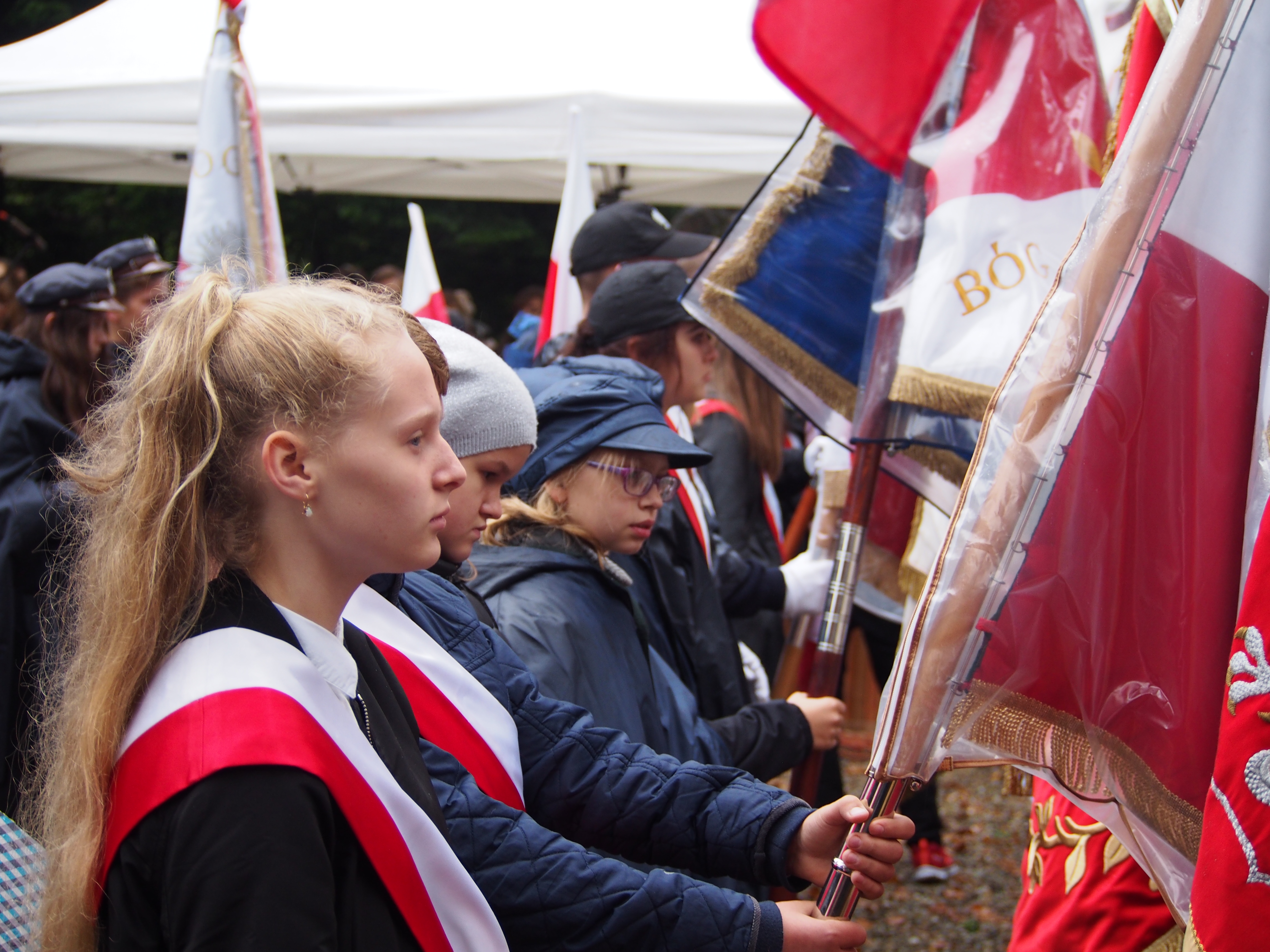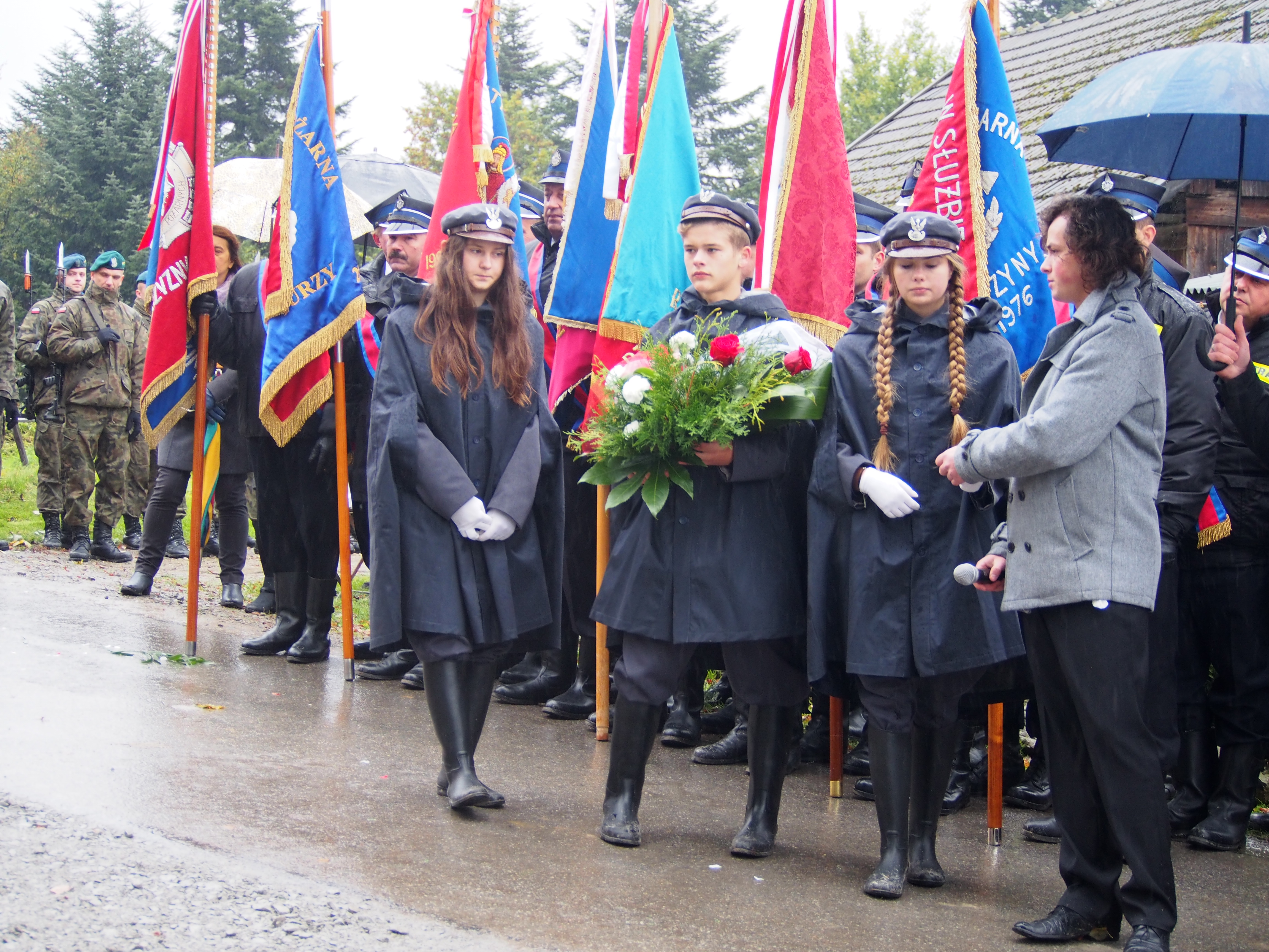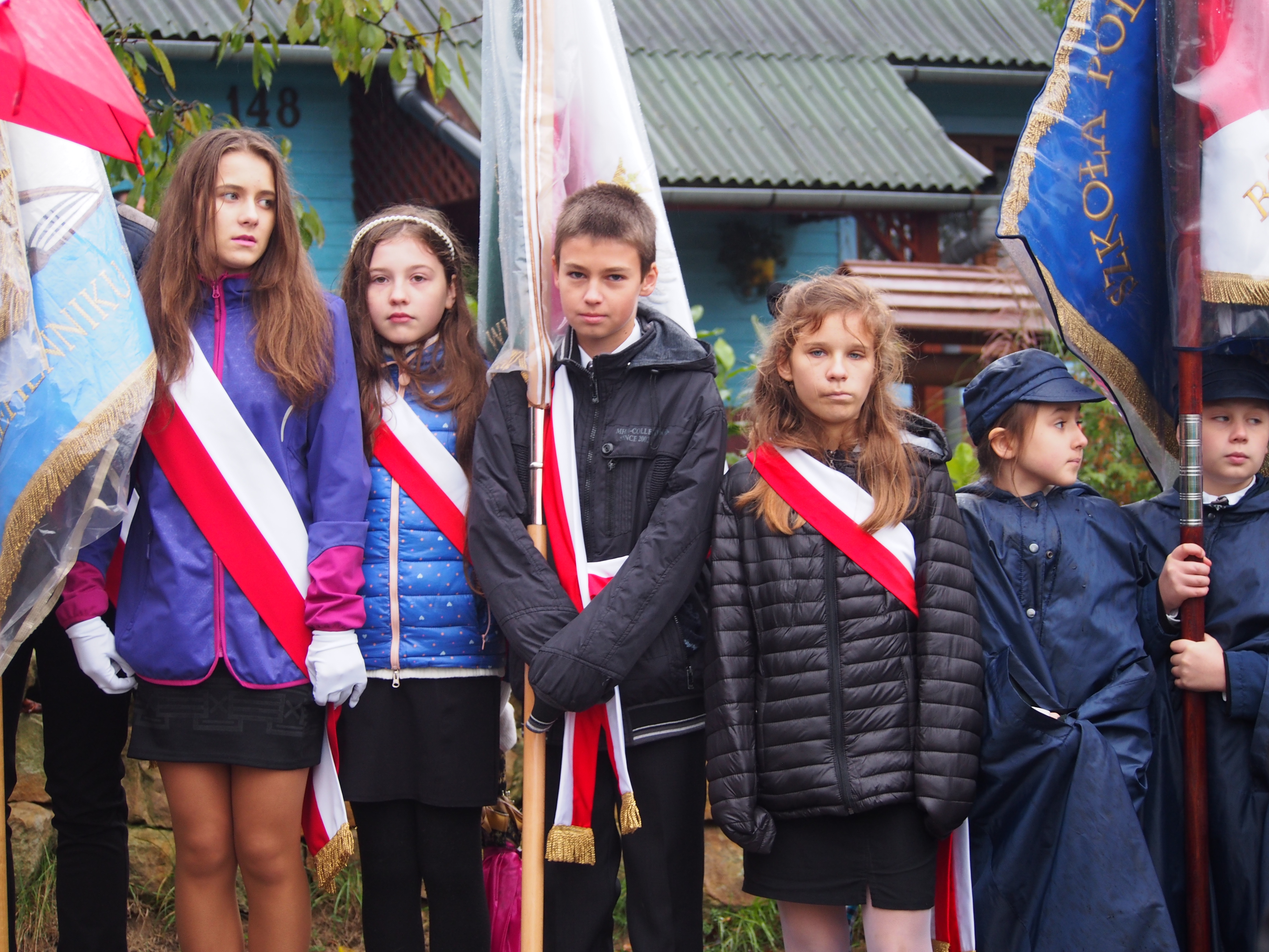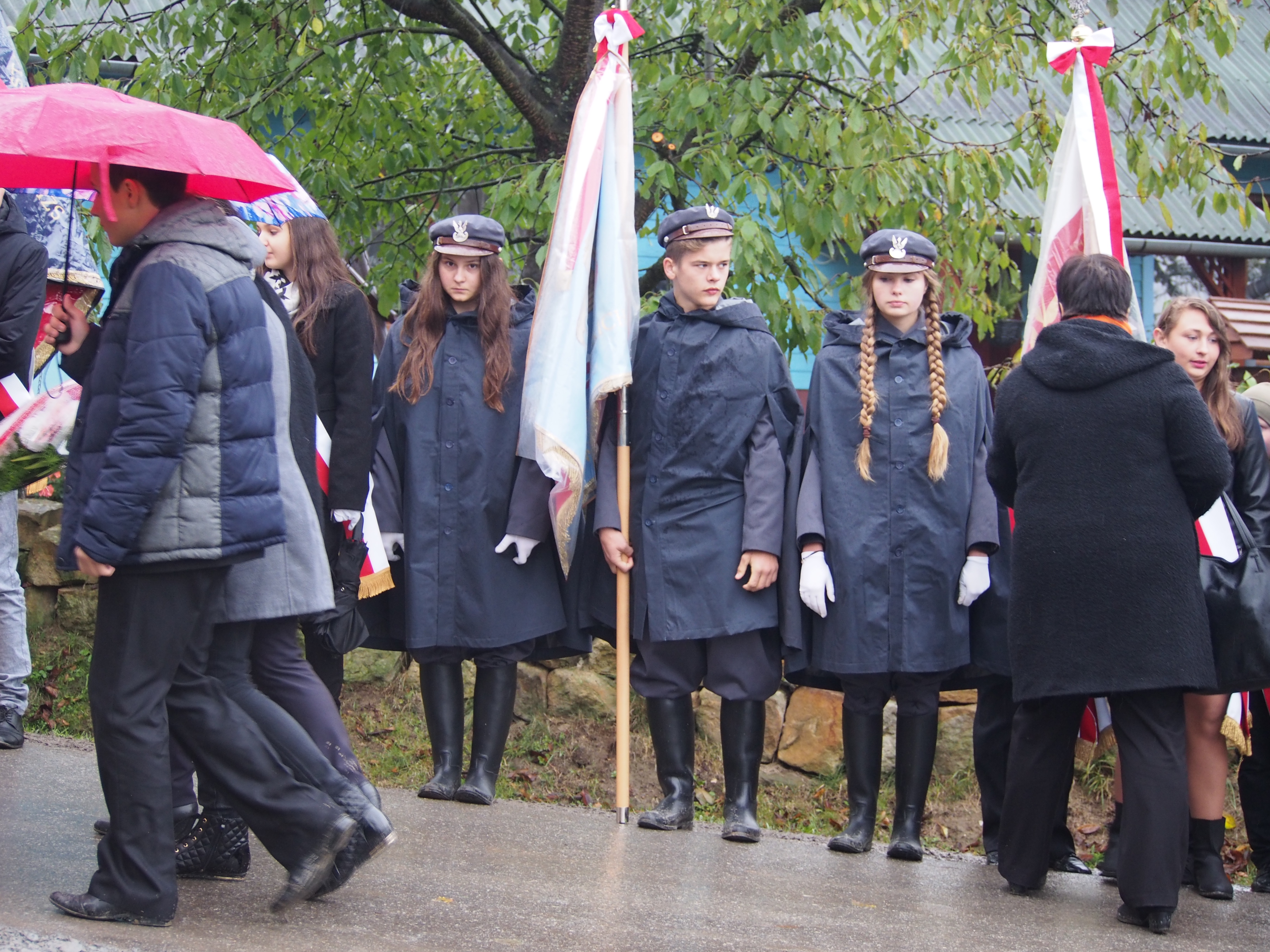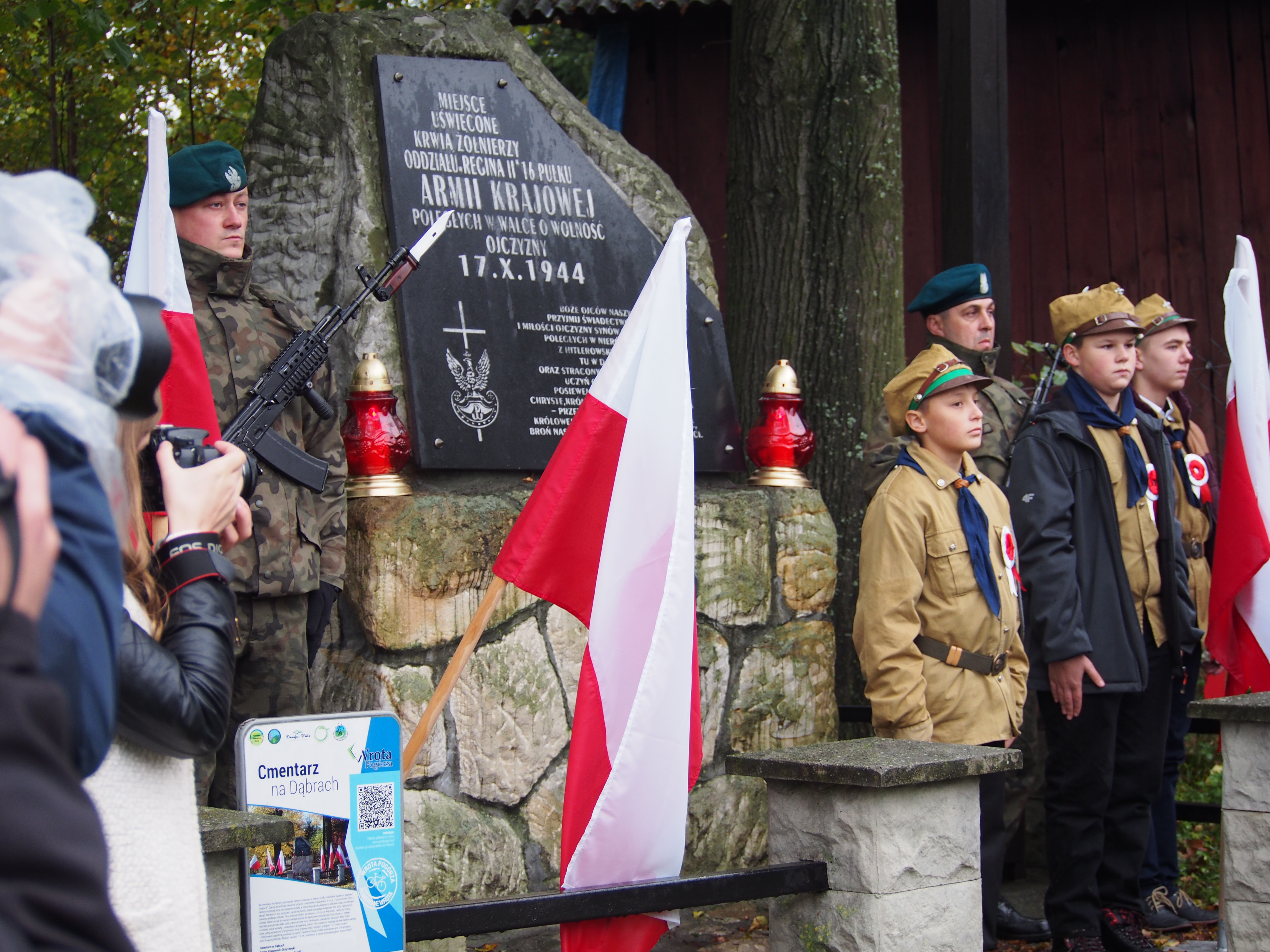 16 października, tym razem w mało sprzyjającej aurze, uczciliśmy pamięć poległych w Dąbrach partyzantów z oddziału Regina II batalionu AK „Barbara”. Skład pocztów sztandarowych tworzyli uczniowie szkoły podstawowej  (Julia Bernaś, Kamila Gieracka, Arkadiusz Kozioł, Justyna Skałoń, Adrian Strach i Martyna Wójcik) oraz gimnazjum (Jakub Bajorek, Marcin Bąk, Gabriela Gogola, Klaudia Gucwa, Weronika Kwaśny i Agnieszka Włudyka). Delegacjami uczniów opiekowali się nauczyciele: panie Halina Kras i Magdalena Moździerz oraz pan Marek Polak.