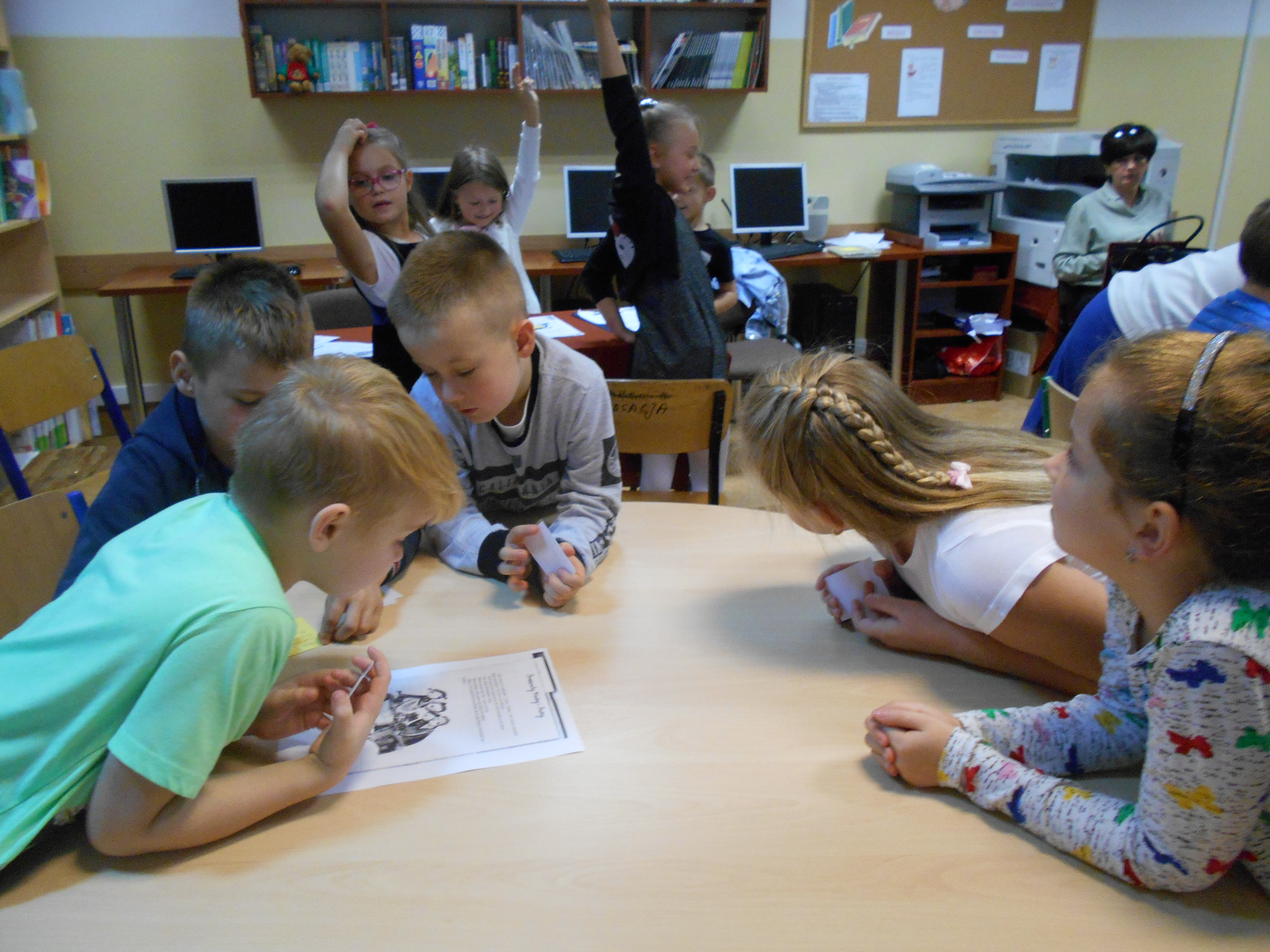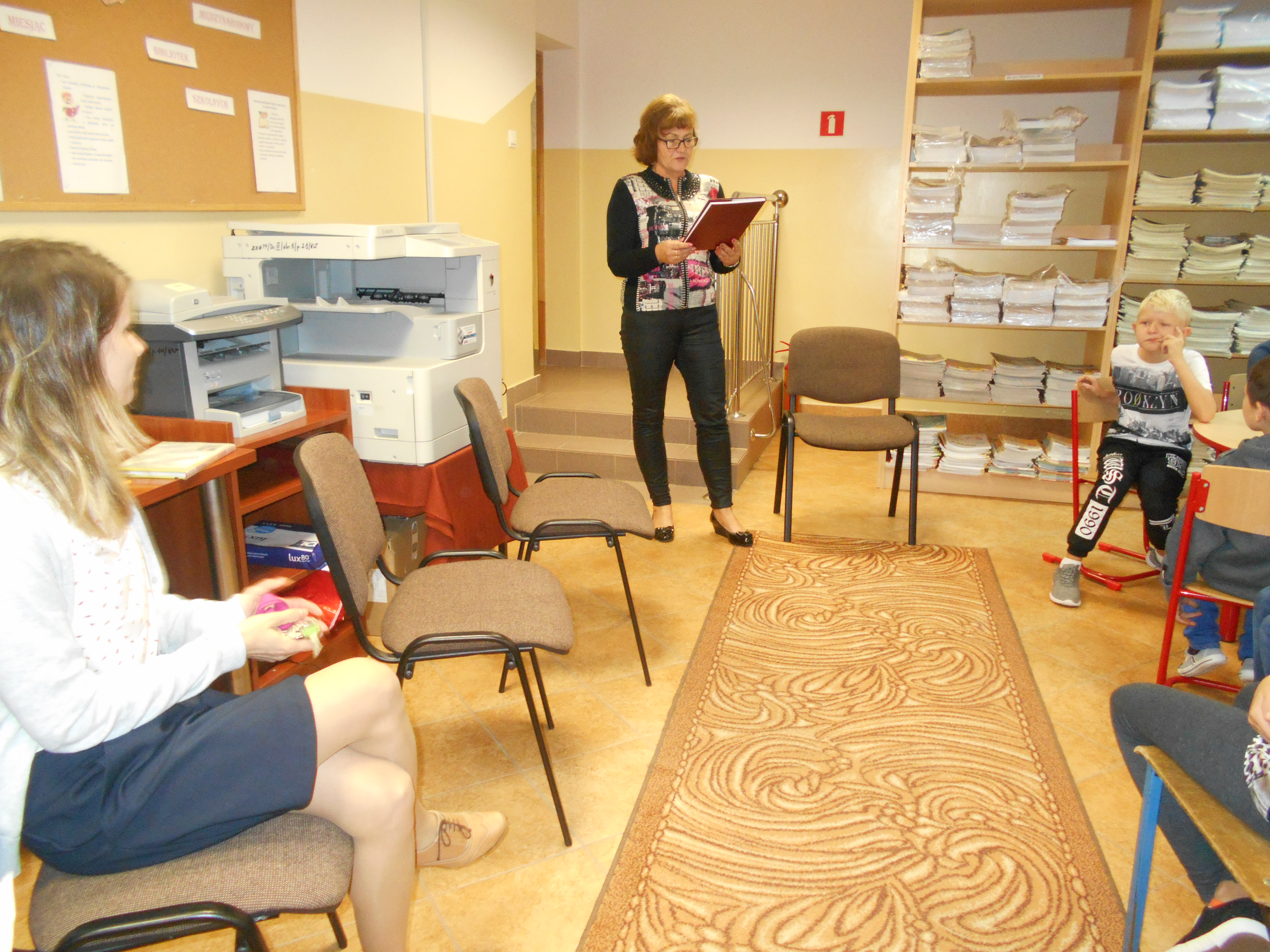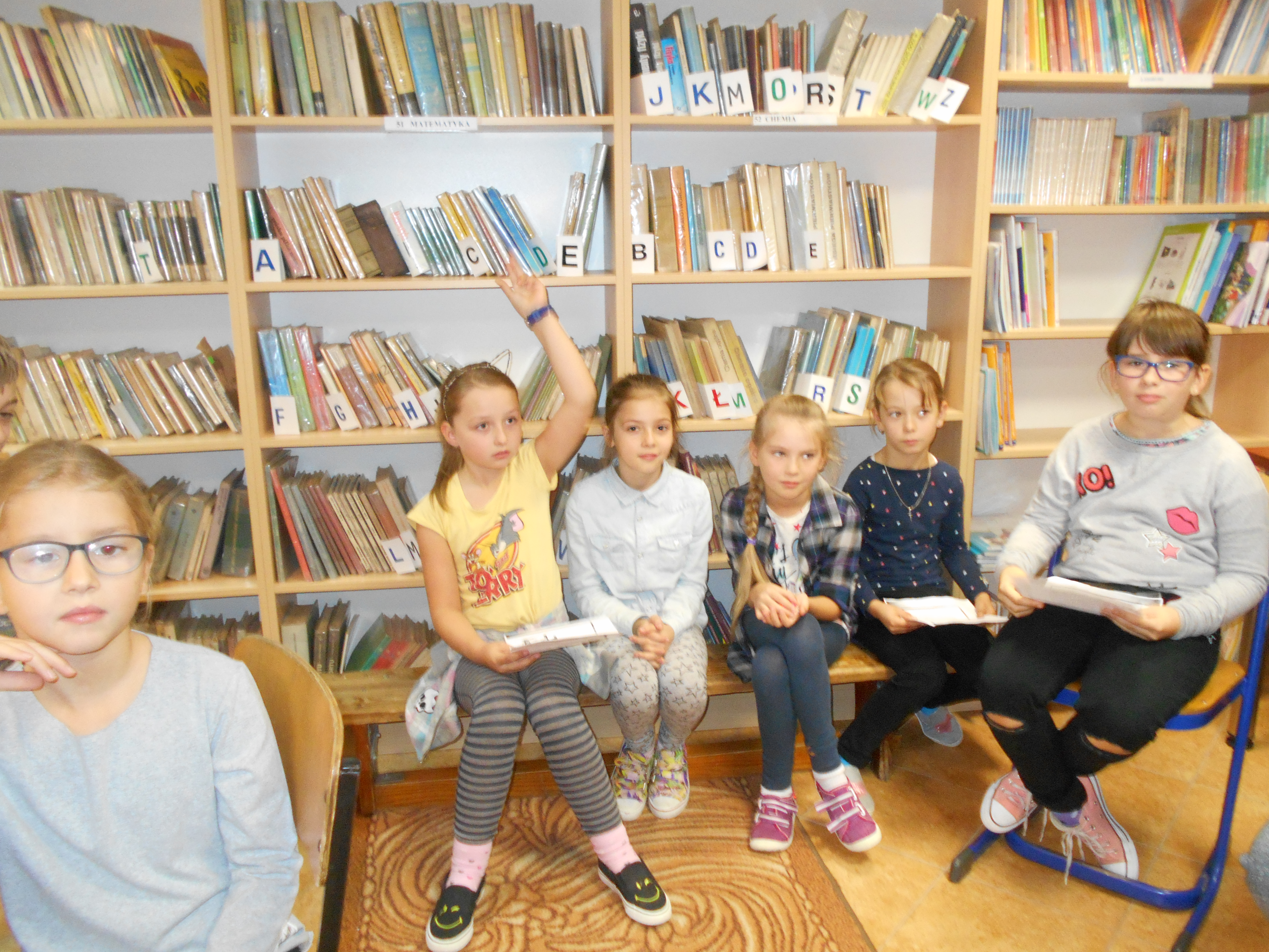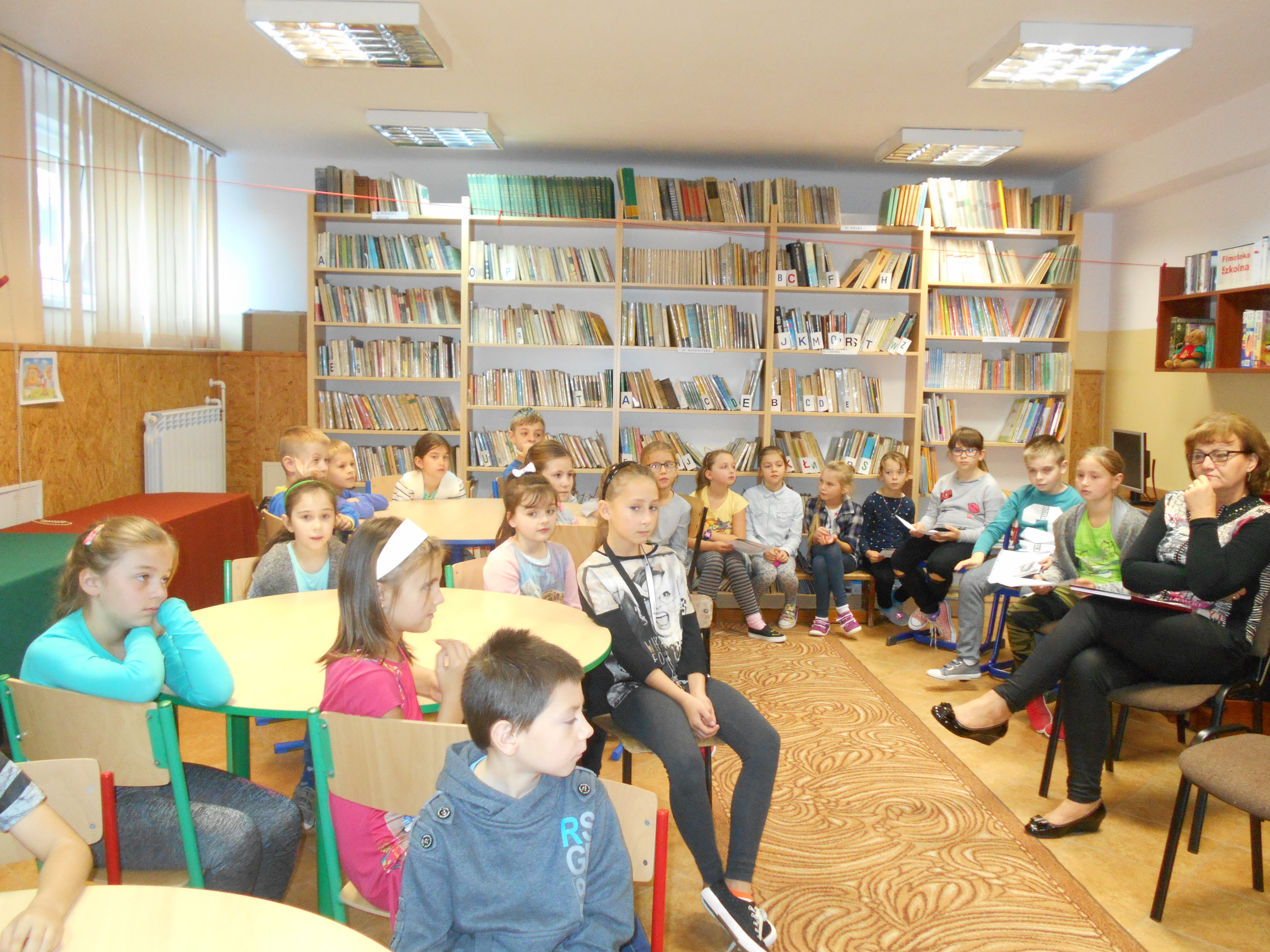 26 października bibliotekę odwiedzili uczniowie klas pierwszych. Wzięli udział w zajęciach zatytułowanych „Witamy w bibliotece szkolnej”. W czasie zajęć dzieci zapoznały się z biblioteką, jej księgozbiorem (szczególnie z częścią przeznaczoną dla najmłodszych czytelników), ze sposobem wypożyczania książek oraz z czytelnią. Bibliotekarka przedstawiła uczniom regulamin biblioteki, zwracając uwagę na terminowość wypożyczania i poszanowanie wypożyczonych książek. Dzieci wysłuchały na ten temat wierszy: