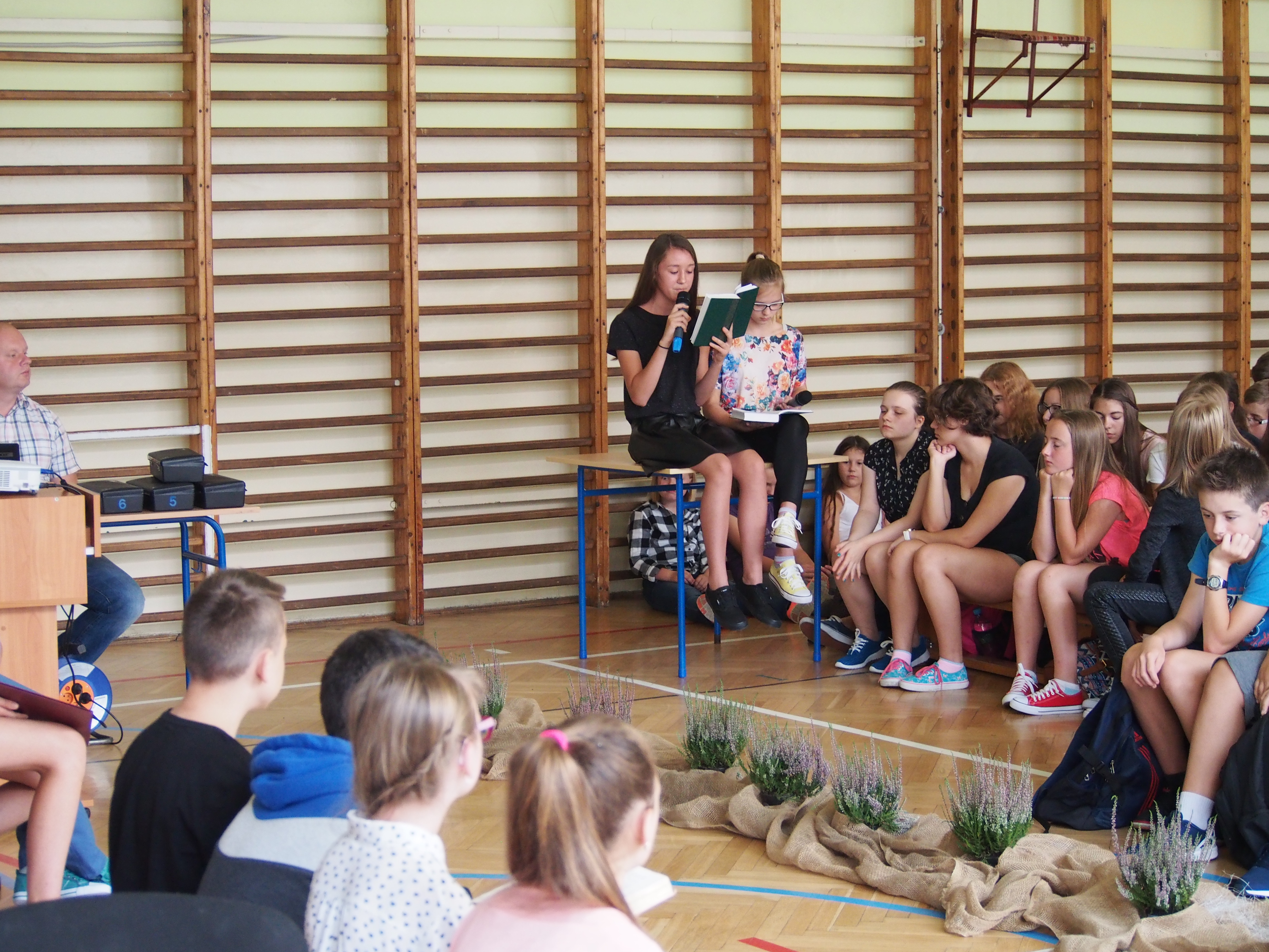 Organizacją przedsięwzięcia zajęli się: p. H. Kurczab – opiekun biblioteki szkolnej, poloniści – p. D. Sowa, p. A. Stachoń, p. M. Polak, a pomocą techniczną służyli- p. T. Baran, p. W. Cudek, p. E. Cudek. Początkowo w sali gimnastycznej zebrali się wszyscy gimnazjaliści oraz szóste klasy, lecz podczas krótkiej przerwy – zaciekawieni szkolnym wydarzeniem –  dołączyli i młodsi uczniowie z wychowawcami.