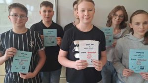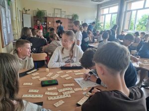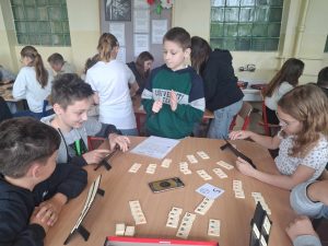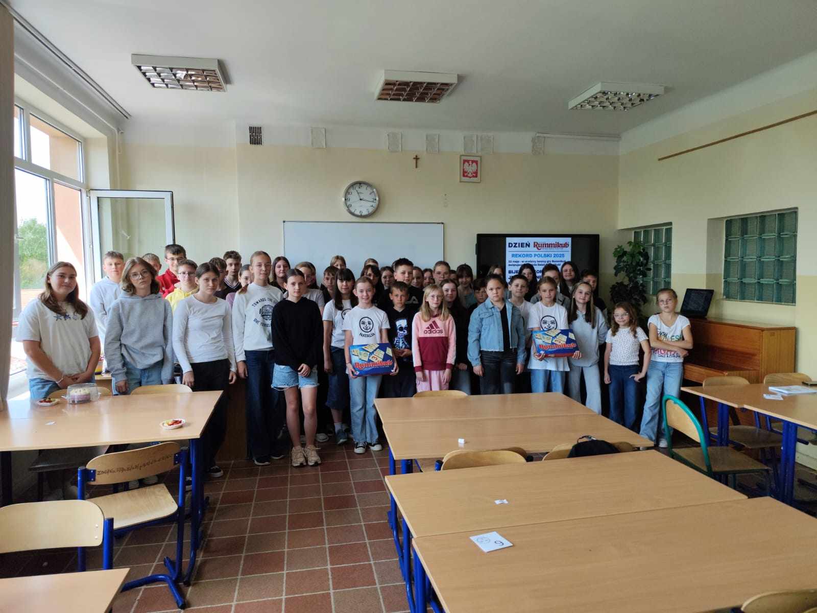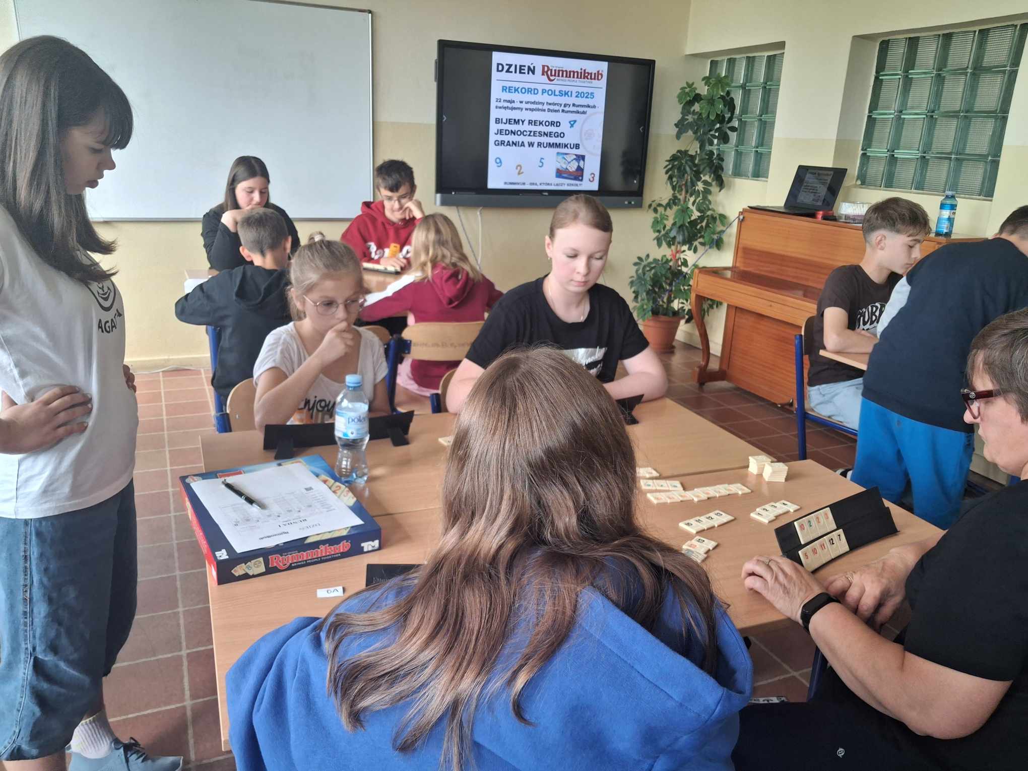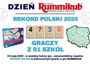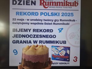 22 maja świętowaliśmy wspólnie Dzień Rummikub pod hasłem „Gra, która łączy szkoły!”. Naszym zadaniem było w ciągu godziny zgromadzić jak największą liczbę grających. Udało nam się spotkać w gronie 50 osób- fascynatów Rummikub. Najlepszym graczem spotkania okazała się Nikola Zając z klasy 6b, która wygrała 4 na 4 rozgrywane rundy i otrzymała w nagrodę urodzinowy torcik Rummikub. Nasza grupa stała się więc częścią Rekordu Polski w jednoczesnym graniu w grę Rummikub, w której wzięło udział 91 szkół i 4736 uczniów z całej Polski. Do zobaczenia za rok….